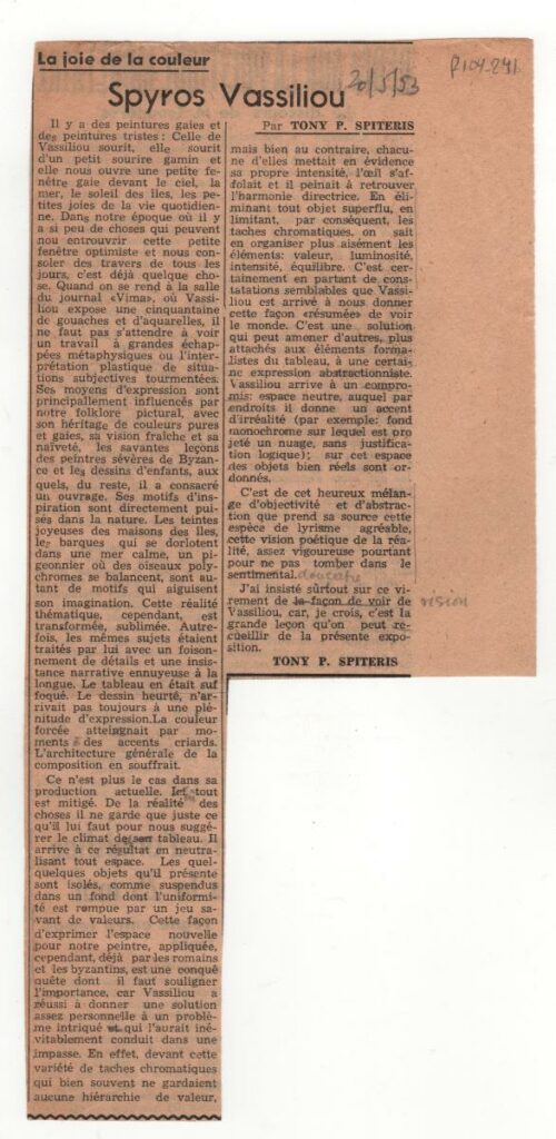 Απόκομμα της εφημερίδας “Le Messager d’ Athènes” (20/05/1953), όπου δημοσιεύεται κριτική του Τώνη Σπητέρη για την ατομική έκθεση του καλλιτέχνη στην αίθουσα τέχνης “Βήματος” στην Αθήνα.