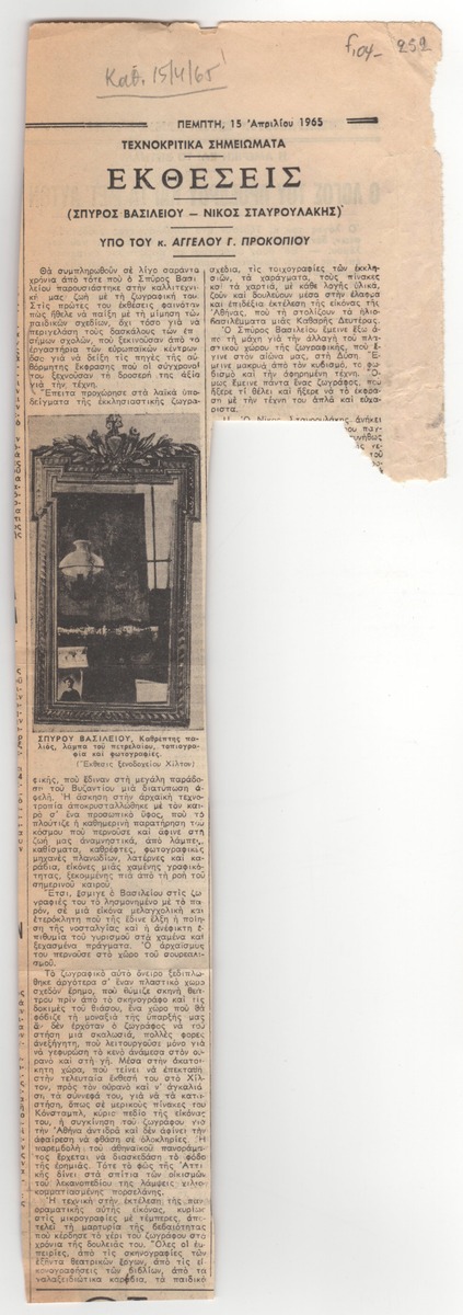 Απόκομμα της εφημερίδας “Η Καθημερινή” (15/04/1965), όπου δημοσιεύεται παρουσίαση της έκθεσης του Σπύρου Βασιλείου στην Αθήνα.