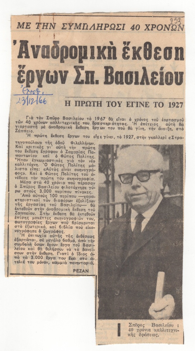 Απόκομμα της εφημερίδας “Ελευθερία” (23/12/1966), όπου δημοσιεύεται άρθρο με αφορμή την διοργάνωση της δεύτερης αναδρομικής έκθεσης έργων του καλλιτέχνη στο Ζάππειο. Γίνεται αναφορά στην πρώτη αναδρομική έκθεση έργων που είχε διοργανωθεί το 1927 στην Αθήνα.