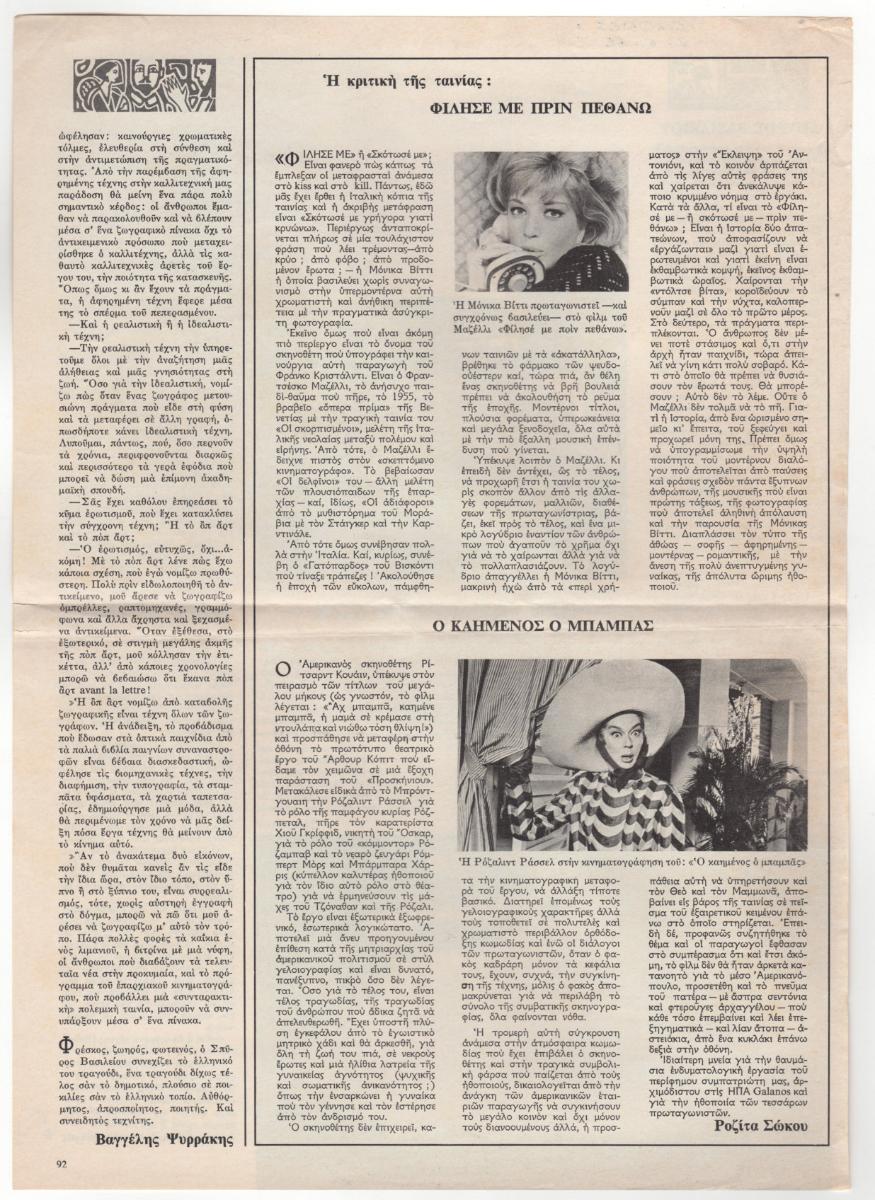 Απόκομμα περιοδικού, χαρτί ιλουστρασιόν, 33,5×23,8 εκ., στα ελληνικά. Κριτική της Ρ. Σώκου για την ταινία του Ιταλού σκηνοθέτη Φραντζέσκο Μαζέλλι “Φίλησέ με πριν πεθάνω” και της ταινίας του αμερικανού σκηνοθέτη Ρίτσαρντ Κουάιν “Ο καημένος ο μπαμπάς”. Εικονογραφείται με αναπαραγωγή φωτογραφιών της Μόνικα Βίττι και της Ρόζαλιντ Ράσσελ, που πρωταγωνιστούν στις δύο ταινίες αντίστοιχα.