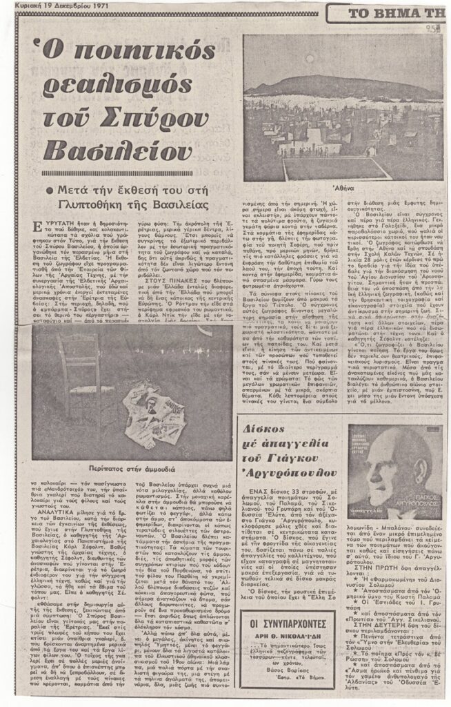 Φωτοαντίγραφο αποκόμματος της εφημερίδας “Το Βήμα” (19/12/1971), όπου δημοσιεύεται άρθρο με θέμα την έκθεση έργων του καλλιτέχνη στη Γλυπτοθήκη της Βασιλείας το 1971.