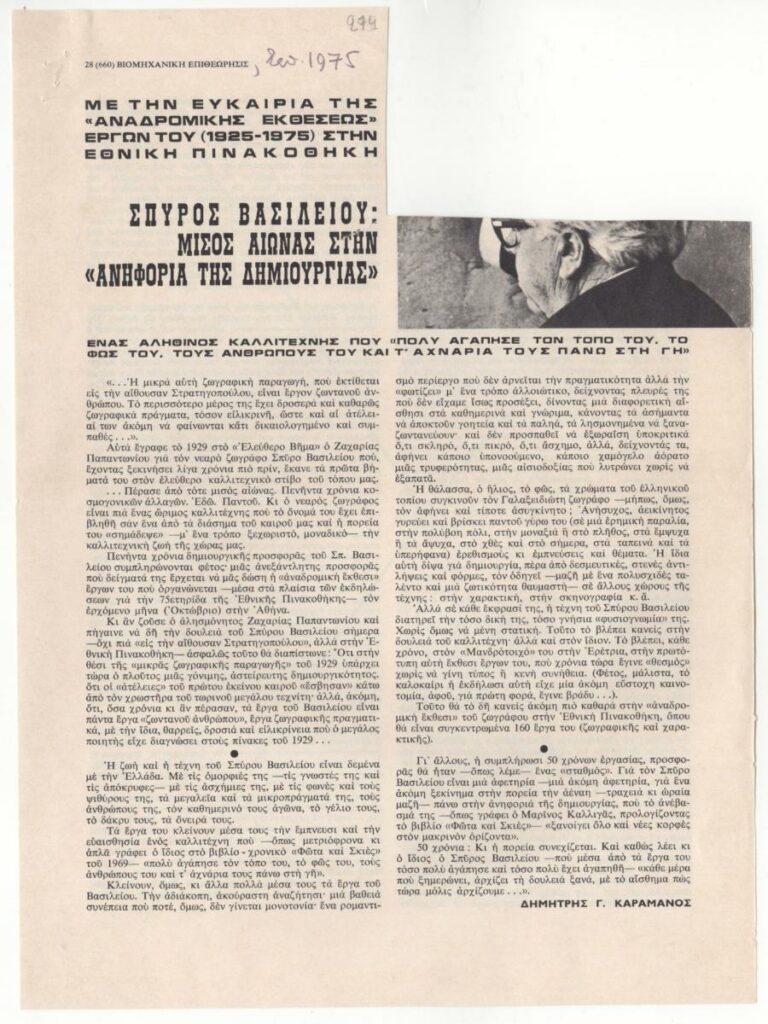 Αποκόμματα περιοδικού, χαρτί και χαρτί ιλουστρασιόν, 2 φφ, 27,8×20,5 εκ., στα ελληνικά. Το δημοσίευμα αφορά την αναδρομικής έκθεσης έργων του καλλιτέχνη στην Εθνική Πινακοθήκη. Εικονογραφείται με φωτογραφία του καλλιτέχνη. Το δεύτερο φύλλο αφορά στο εξώφυλλο που εικονογραφείται με αναπαραγωγή έργου του καλλιτέχνη. Στην πίσω όψη διαφήμιση της εταιρίας “Τσιμέντα Ηρακλής”