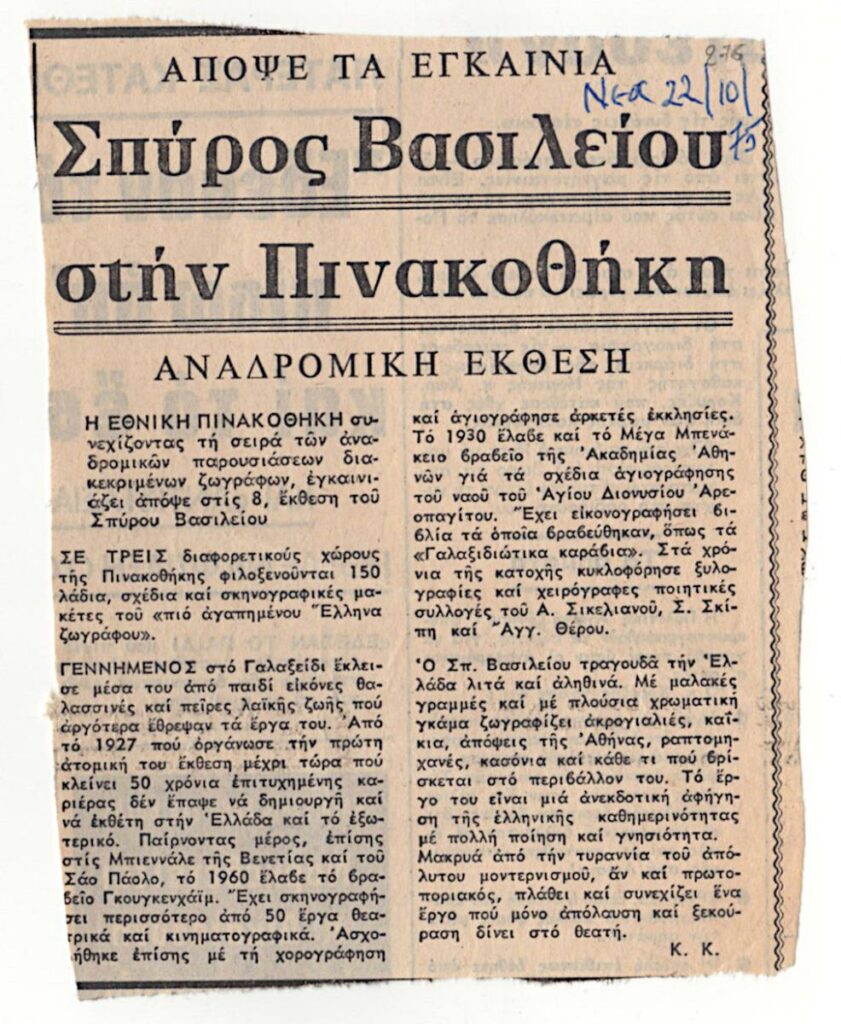 Απόκομμα εφημερίδας, χαρτί, 13,5×11,0 εκ., στα ελληνικά. Δημοσίευμα σχετικά με τα εγκαίνια της αναδρομικής έκθεσης έργων του καλλιτέχνη στην Εθνική Πινακοθήκη. Στο πάνω μέρος του αποκόμματος επιγραφή.