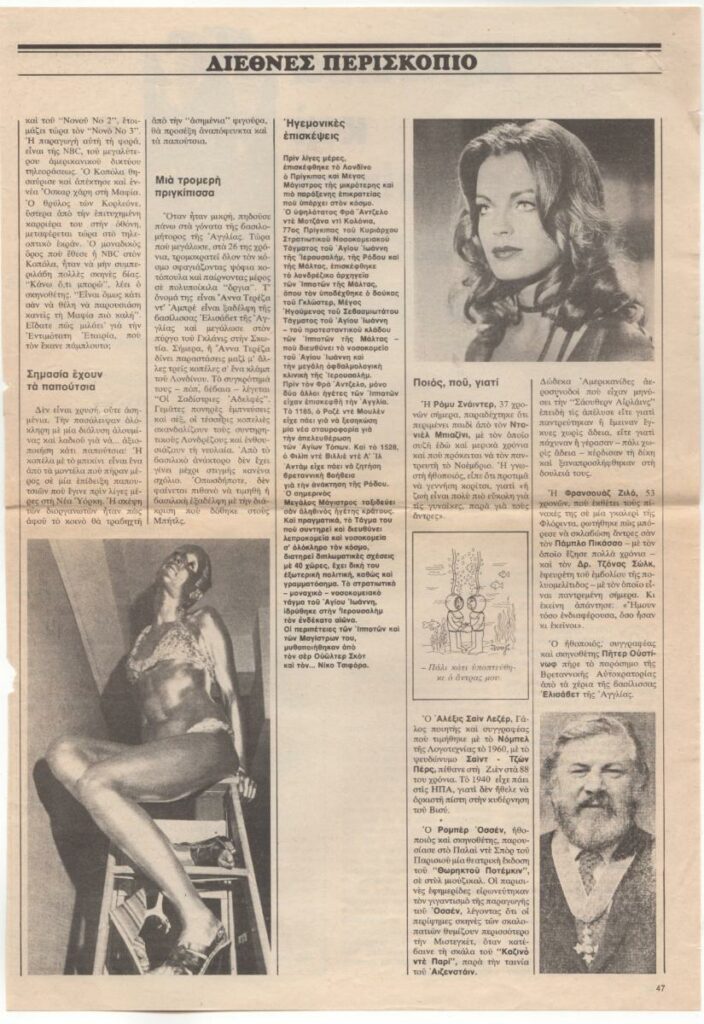 Απόκομμα, έντυπο, χαρτί, 33,5×23,5 εκ., όπου δημοσιεύονται, στα ελληνικά, ειδήσεις από την πολιτιστική επικαιρότητα της περιόδου. Αναφέρονται ο θάνατος του νομπελίστα συγγραφέα Σαιντ-Τζων Περς, την παραγωγή σε στιλ μούσικαλ μία θεατρικής έκδοσης της ταινίας “Θωρηκτό Ποτέμκιν” σε σκηνοθεσία του Ρομπέρ Οσσέν στο Παλαί ντε Σπορ του Παρισιού, την έκθεση της Φρανσουάζ Ζιλό, ερωμένης του Πάμπλο Πικάσσο και του δρ. Τζόνας Σώλκ σε μία γκαλερί της Φλόριντα και την απονομή του παράσημου της Βρεταννικής Αυτοκρατορίας στον Πήτερ Ουστίνωφ. Εικονογραφείται με αναπαραγωγή φωτογραφίας του Π. Ουστίνωφ. Στην άλλη όψη άρθρο για τον Σπ. Βασιλείου, και δημοσίευμα για την κατάσταση στην ελληνική παιδεία
