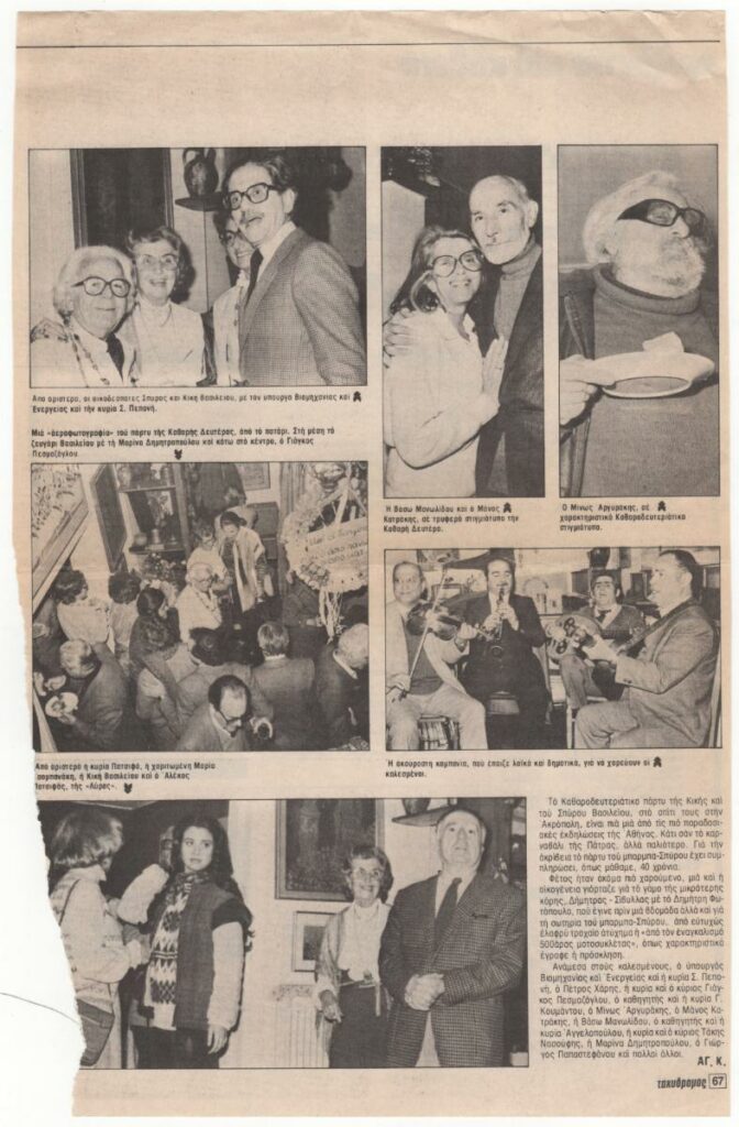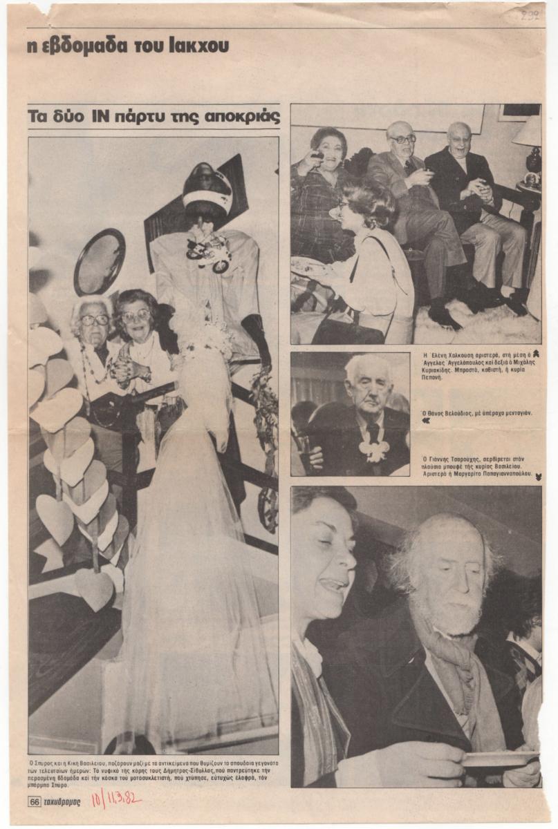 Απόκομμα περιοδικού, χαρτί, 2 φύλλα, 22,5×21 εκ., στα ελληνικά. Φωτορεπορτάζ του/της ΑΓ.Κ. από το Καθαροδευτεριάτικο πάρτυ της Κικής του Σπύρου Βασιλείου στο σπίτι τους στην Ακρόπολη.