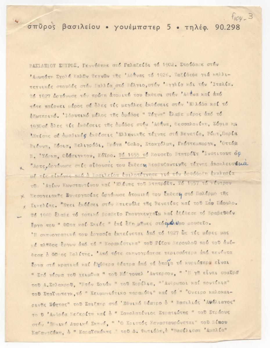 Κείμενο, δακτυλόγραφο με χειρόγραφες διορθώσεις, χαρτί, 3 φφ, 28,5×21,5, στα ελληνικά. Βιογραφικό του Σπύρου Βασιλείου με αναλυτική αναφορά στην καλλιτεχνική του δράση. Χρονολογείται πριν το 1985 (δεν αναφέρεται έτος θανάτου). Δακτυλογραφημένο σε χαρτί με τα στοιχεία του καλλιτέχνη στην κεφαλίδα.