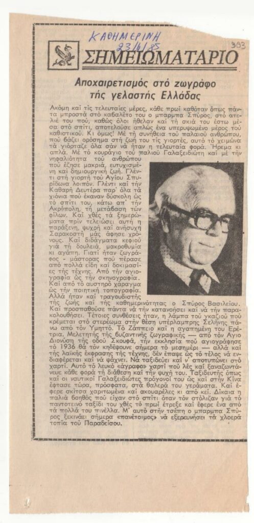 Απόκομμα εφημερίδας, χαρτί, 24,0×11,5 εκ. στα ελληνικά. Δημοσίευμα για το ζωγράφο στη στήλη “Σημειωματάριο” με αφορμή το θάνατό του. Εικονογραφείται με φωτογραφία του καλλιτέχνη. Πάνω από τον τίτλο επιγραφή.