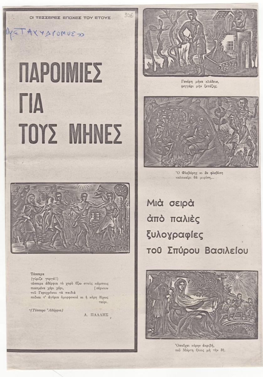 Φωτοαντίγραφο αποκόμματος περιοδικού, χαρτί, 2 φφ, 30,0×21,0 εκ., στα ελληνικά. Το δημοσίευμα αφορά στην παρουσίαση μίας σειράς από 12 ξυλογραφίες του καλλιτέχνη για τους δώδεκα μήνες του χρόνου. Εικονογραφείται από αναπαραγωγές έργων που συνοδεύεται η κάθε μία από μία παροιμία για τον αντίστοιχο μήνα. Στην πρώτη σελίδα επιγραφή.