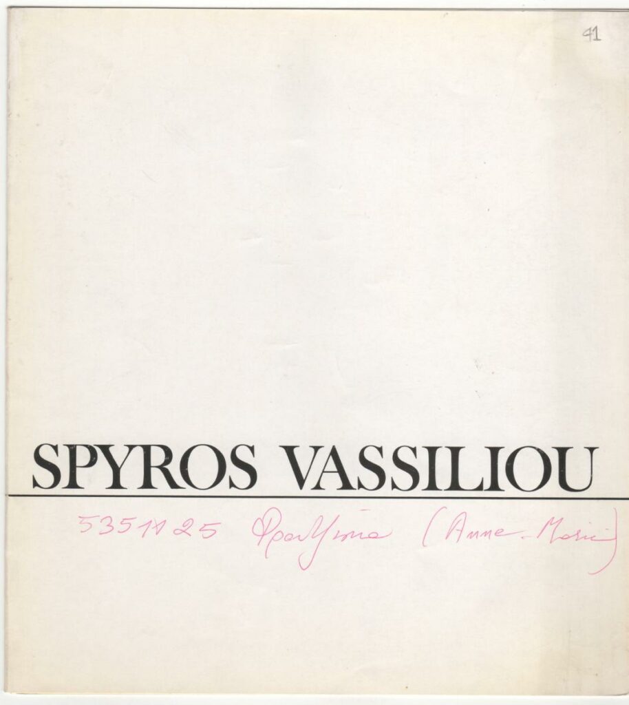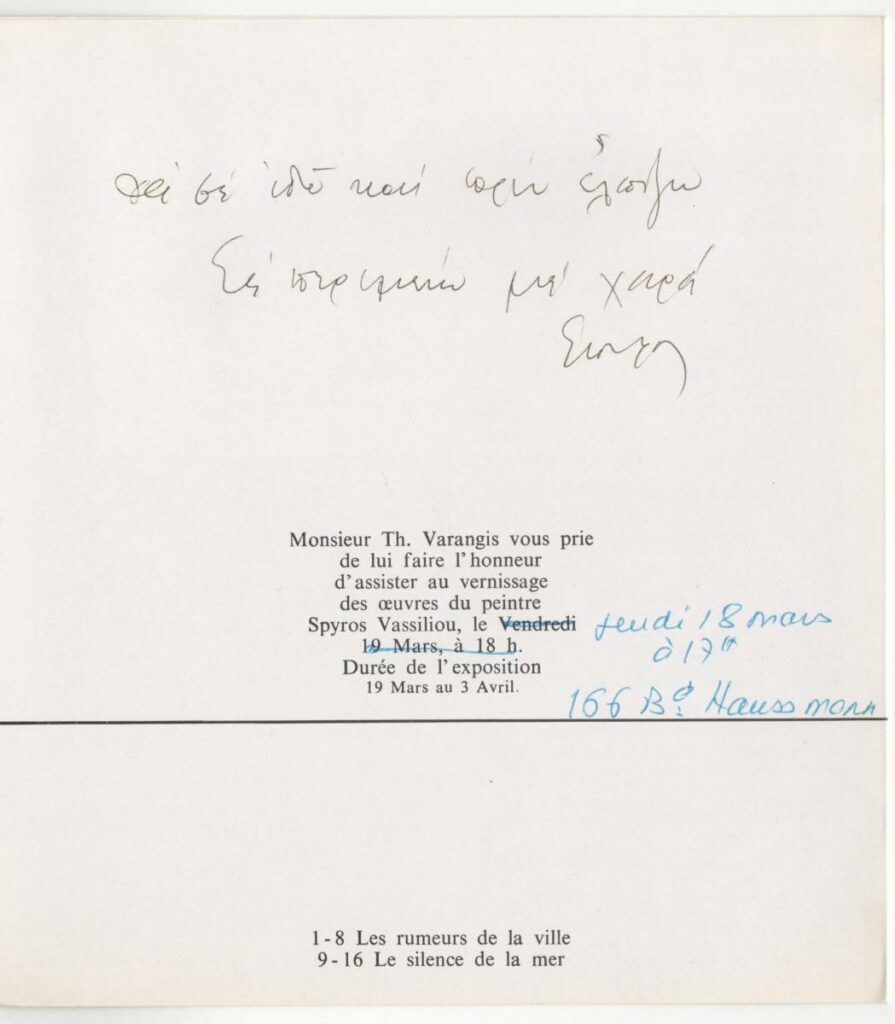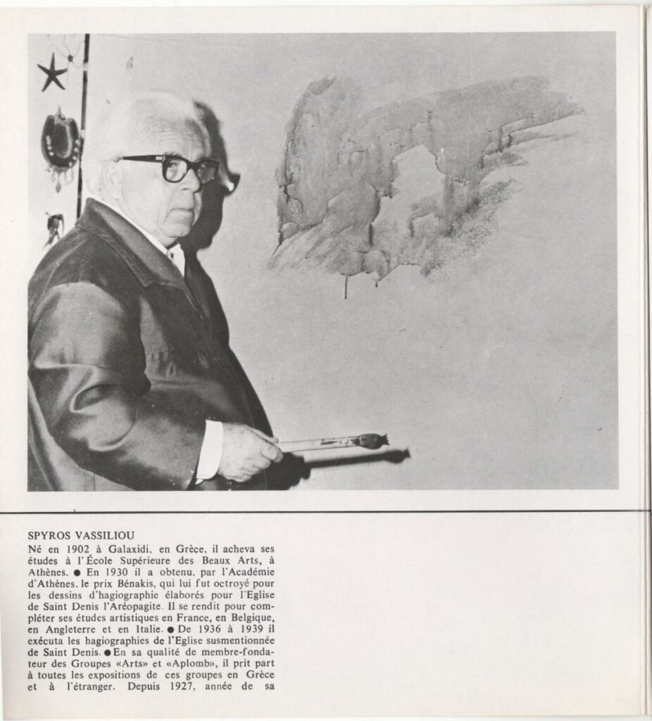 Έντυπο της ατομικής έκθεσης του Σπύρου Βασιλείου στο Maison de Decoration Varangis στο Παρίσι. Περιέχει συνοπτικό βιογραφικό καλλιτέχνη. Εικονογραφείται με φωτογραφία του καλλιτέχνη στο ατελιέ του και αναπαραγωγές έργων. Εσωτερικά χειρόγραφη πρόσκληση του καλλιτέχνη.