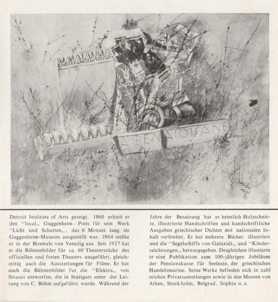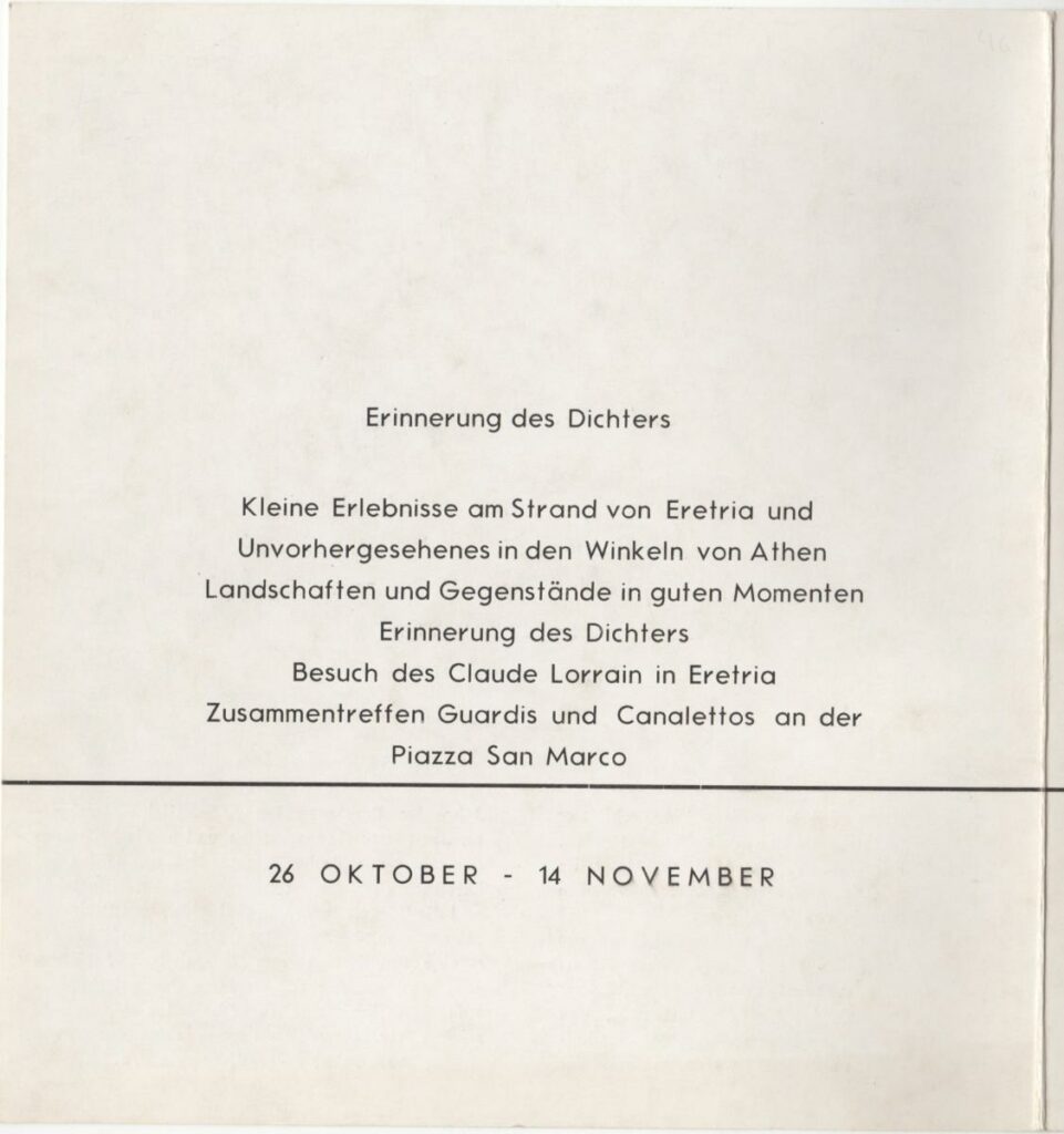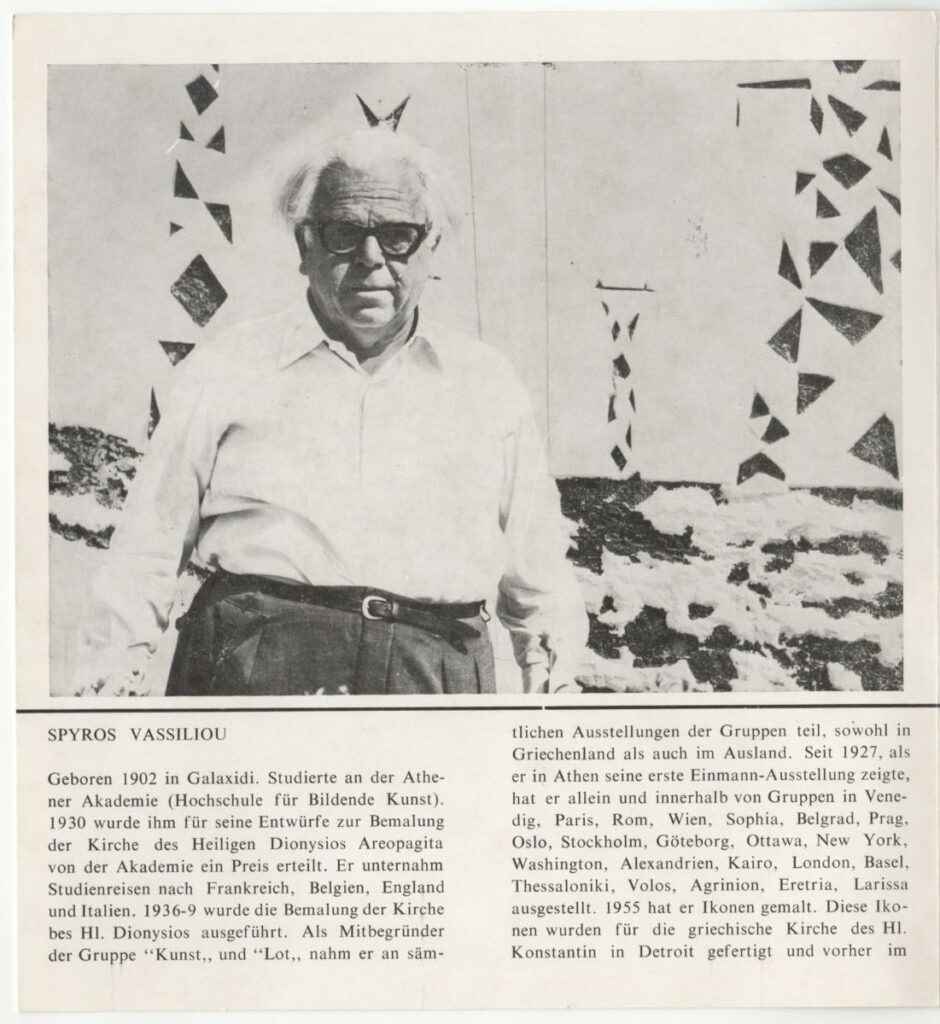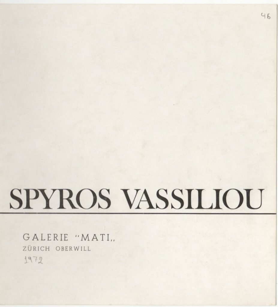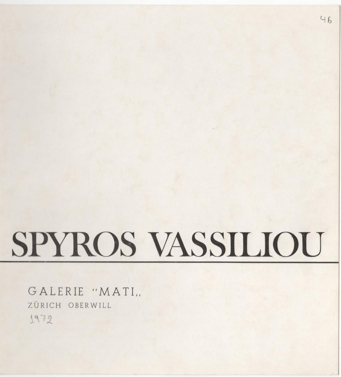 Έντυπο της ατομικής έκθεσης του Σπύρου Βασιλείου στην Galerie “MATI” στη Ζυρίχη. Περιέχει σύντομο βιογραφικό καλλιτέχνη, αναπαραγωγή φωτογραφίας καλλιτέχνη και έργου.