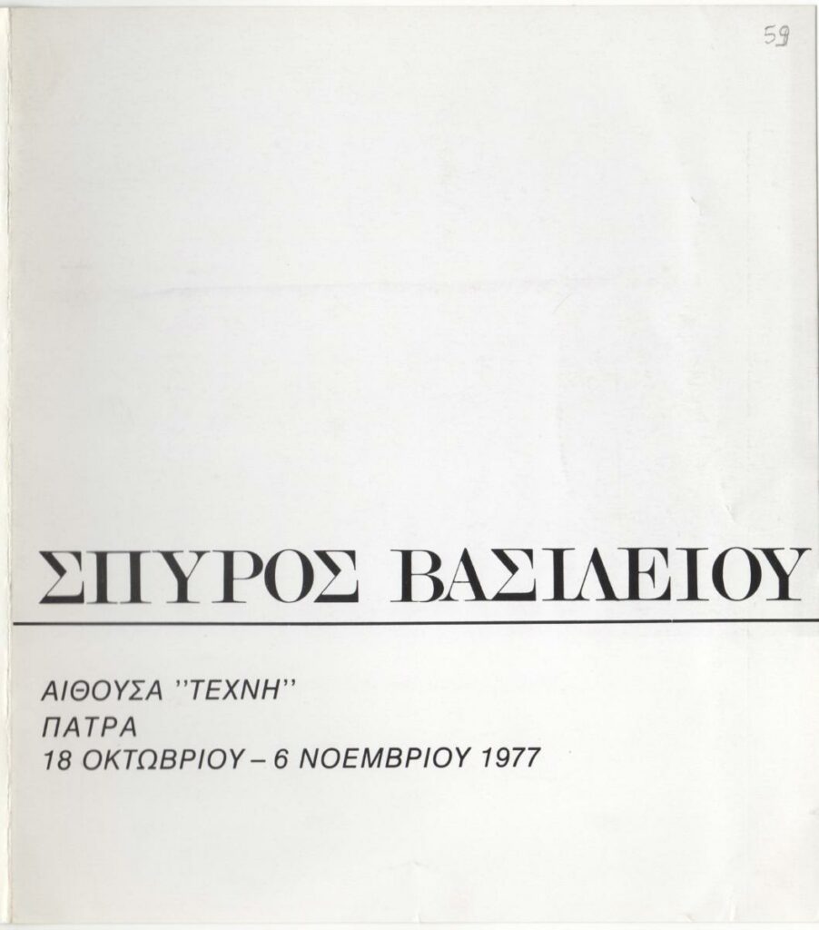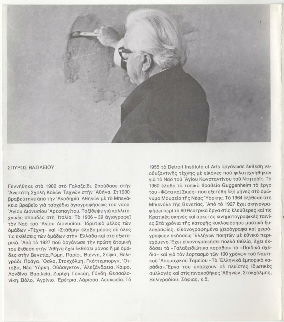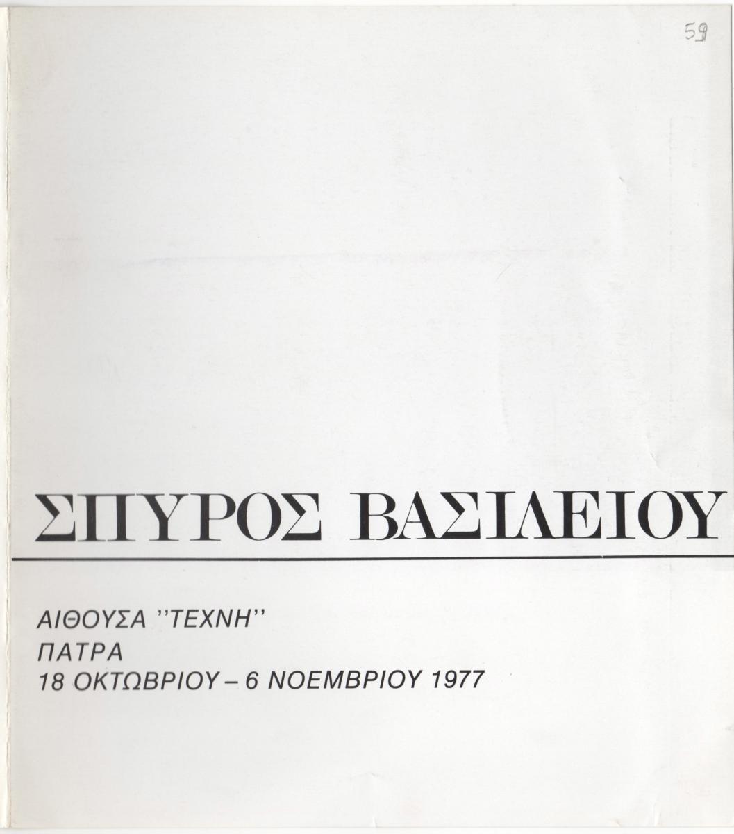 Έντυπο έκθεσης του Σπύρου Βασιλείου στη Μακεδονική Καλλιτεχνική Εταιρεία Τέχνη στην Πάτρα. Περιέχει σύντομο βιογραφικό καλλιτέχνη, αναπαραγωγή έργου και φωτογραφία του καλλιτέχνη.
