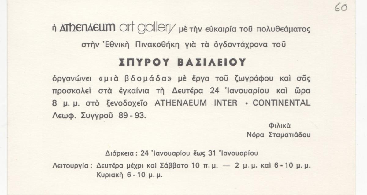Πρόσκληση έκθεσης στην Atheneum Art Gallery με την ευκαιρία του πολυθεάματος στην Εθνική Πινακοθήκη για τα ογδοντάχρονα του καλλιτέχνη. Υπογράφει η Νόρα Σταματιάδου.