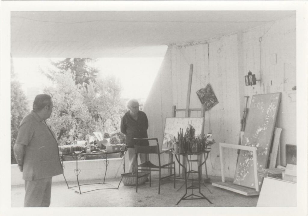 Φωτογραφία του Τώνη Σπητέρη με τον Σπύρο Βασιλείου μπροστά σε έργα του, α/μ, σε φωτογραφικό χαρτί, 9,0×12,5 εκ. Στην πίσω όψη σφραγίδα με αρίθμηση και ημερομηνία.