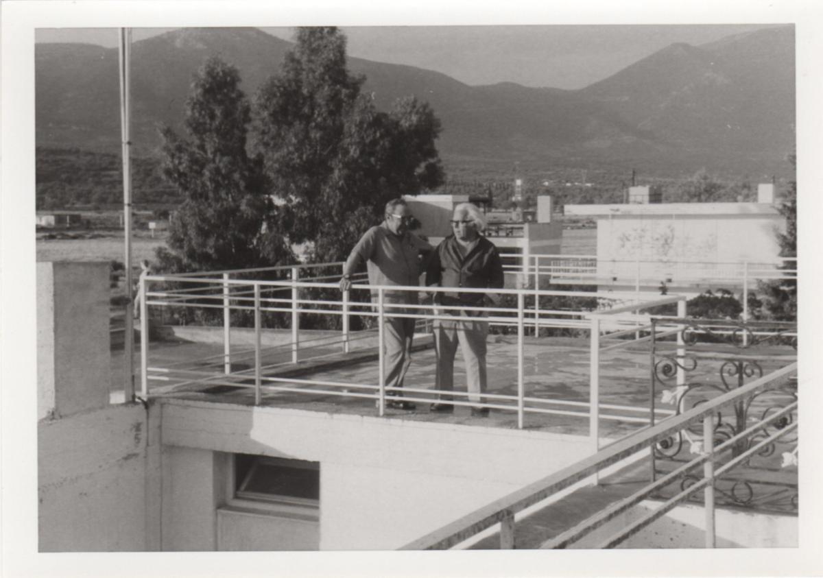 Φωτογραφία του Σπύρου Βασιλείου με τον Τώνη Σπητέρη, α/μ, σε φωτογραφικό χαρτί. Στην πίσω όψη σφραγίδα με ημερομηνία και αρίθμηση