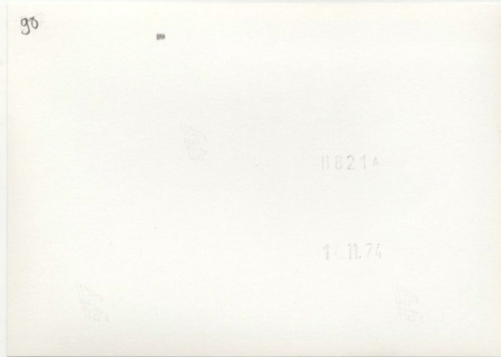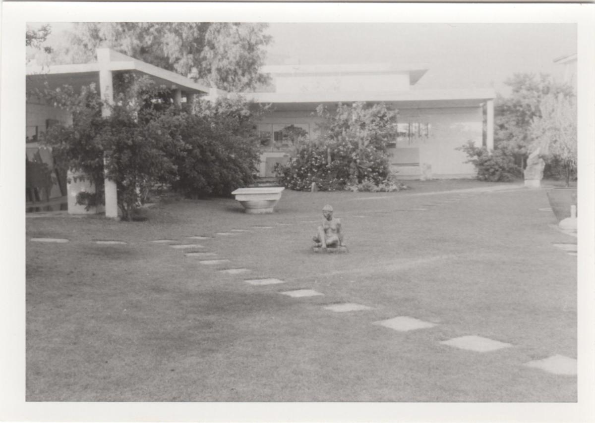 Φωτογραφία υπαίθριου χώρου και κτιρίου, σε πρώτο πλάνο γλυπτό, α/μ, 9,0×12,7 εκ. Στην πίσω όψη σφραγίδα με αρίθμηση και ημερομηνία.