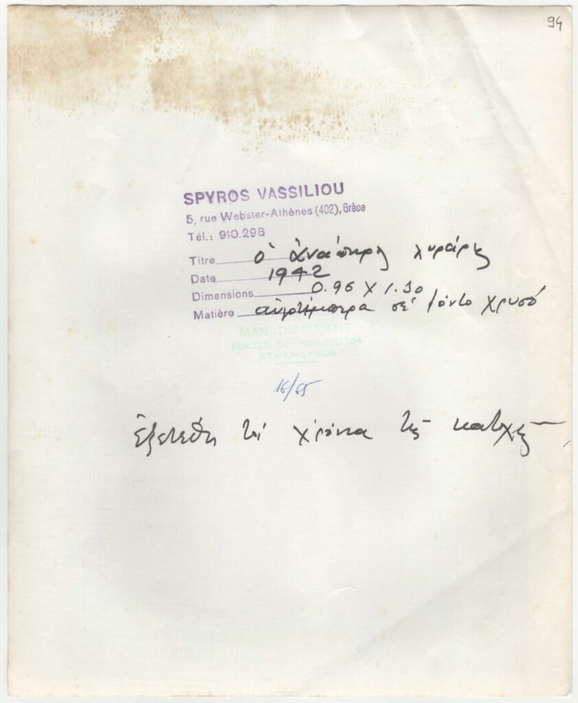 Φωτογραφία, α/μ, φωτογραφικό χαρτί, 25,2×20,5 εκ. Αναπαραγωγή έργου του Σπύρου Βασιλείου. Στην πίσω όψη σφραγίδα του καλλιτέχνη με συμπληρωμένα χειρόγραφα τα στοιχεία του έργου, σφραγίδα φωτογράφου και άλλες επιγραφές.