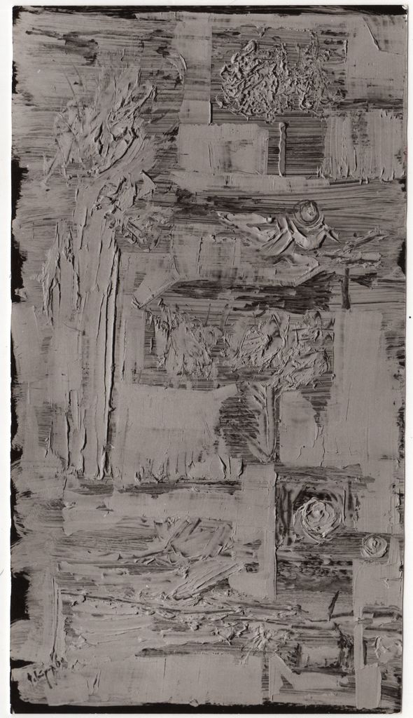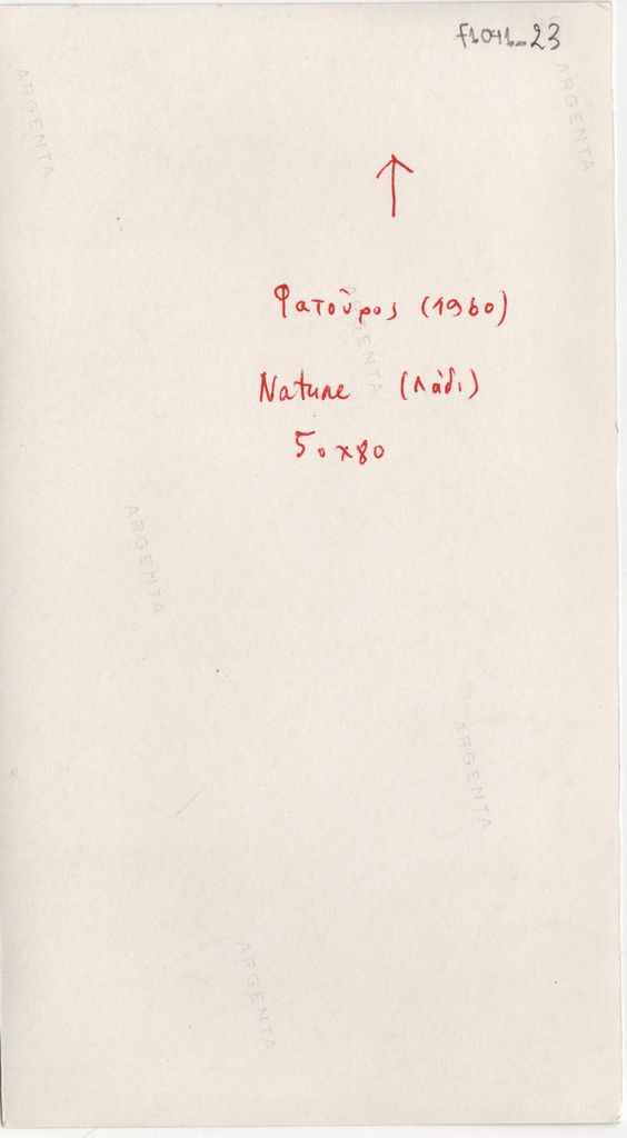 Φωτογραφία, α/μ, φωτογραφικό χαρτί, 17,5×9,7 εκ. Αναπαραγωγή του έργου του Δημήτρη Φατούρου “Nature” (λάδι, 1960). Στην πίσω όψη, επιγραφή.