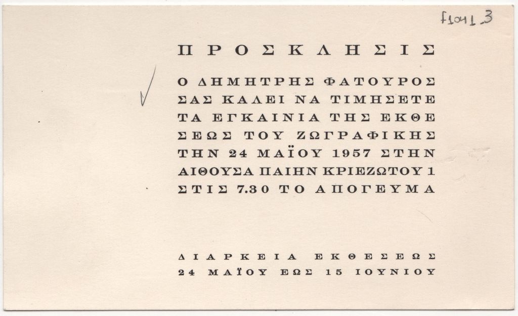Έντυπο, στα ελληνικά, μονόφυλλο, χαρτόνι. Πρόσκληση εγκαινίων της ατομικής έκθεσης ζωγραφικής του Δημήτρη Φατούρου στην Αίθουσα Παίην στην Αθήνα το 1957.