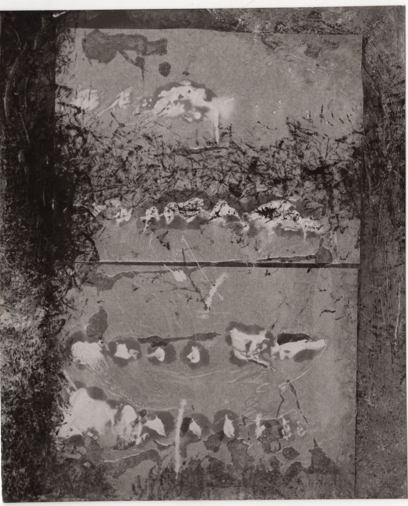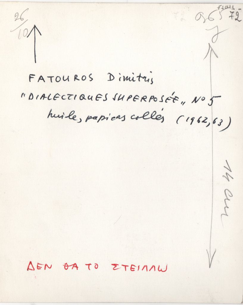 Φωτογραφία, α/μ, φωτογραφικό χαρτί, 14,5×12,0 εκ. Αναπαραγωγή του έργου του Δημήτρη Φατούρου “Dialectique Superposée No 4”, (λάδι, χαρτί, 1963-1964). Στην πίσω όψη, επιγραφή.
