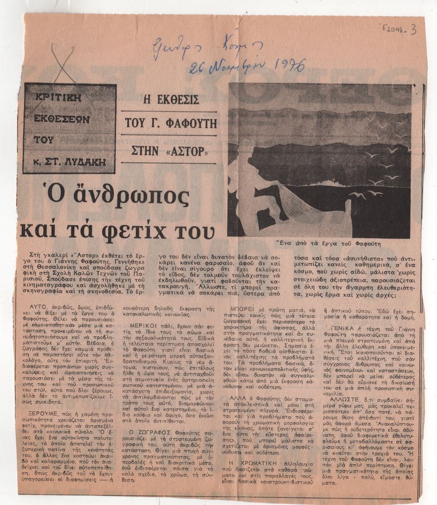 Απόκομμα, έντυπο, χαρτί, 24,8×20,5 εκ., όπου δημοσιεύεται, στα ελληνικά, κριτική του Στέλιου Λυδάκη για την ατομική έκθεση ζωγραφικής του Γιάννη Φαφούτη στην Αθήνα το 1976. Επάνω, επιγραφή.