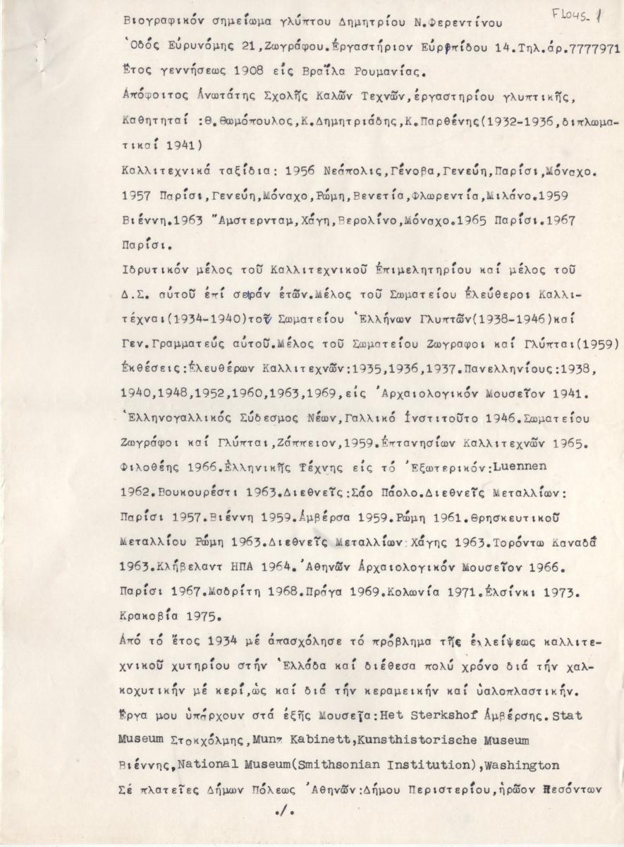 Κείμενο, δακτυλόγραφο με χειρόγραφες διορθώσεις, στα ελληνικά, σε χαρτί, 3 φφ, 29,0×21,5 εκ. Βιογραφικό σημείωμα του γλύπτη Δημήτριου Φερεντίνου, συνταγμένο από τον καλλιτέχνη. Αναφέρονται σπουδές, καλλιτεχνικά ταξίδια, εκθέσεις, καλλιτεχνική πορεία, συμμετοχές σε συνέδρια και άλλες δραστηριότητες. Υπογεγραμμένο από τον καλλιτέχνη.