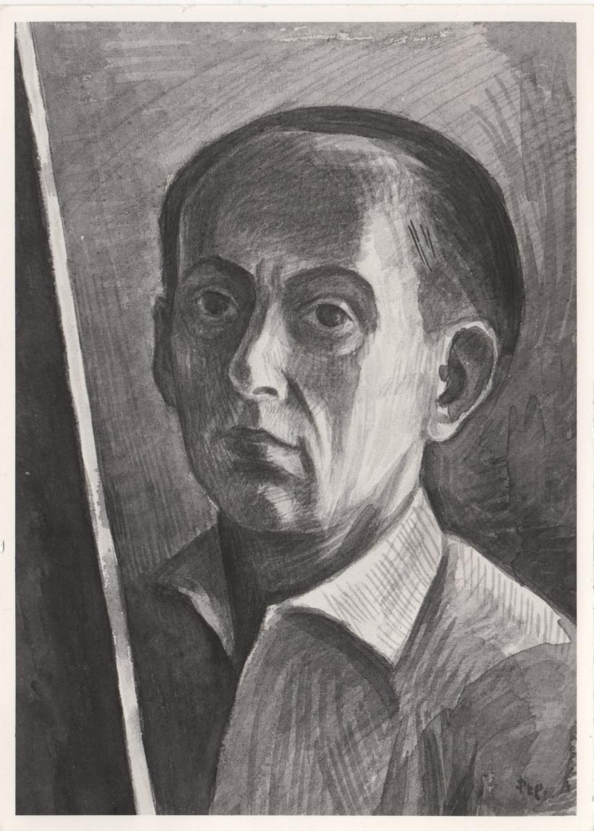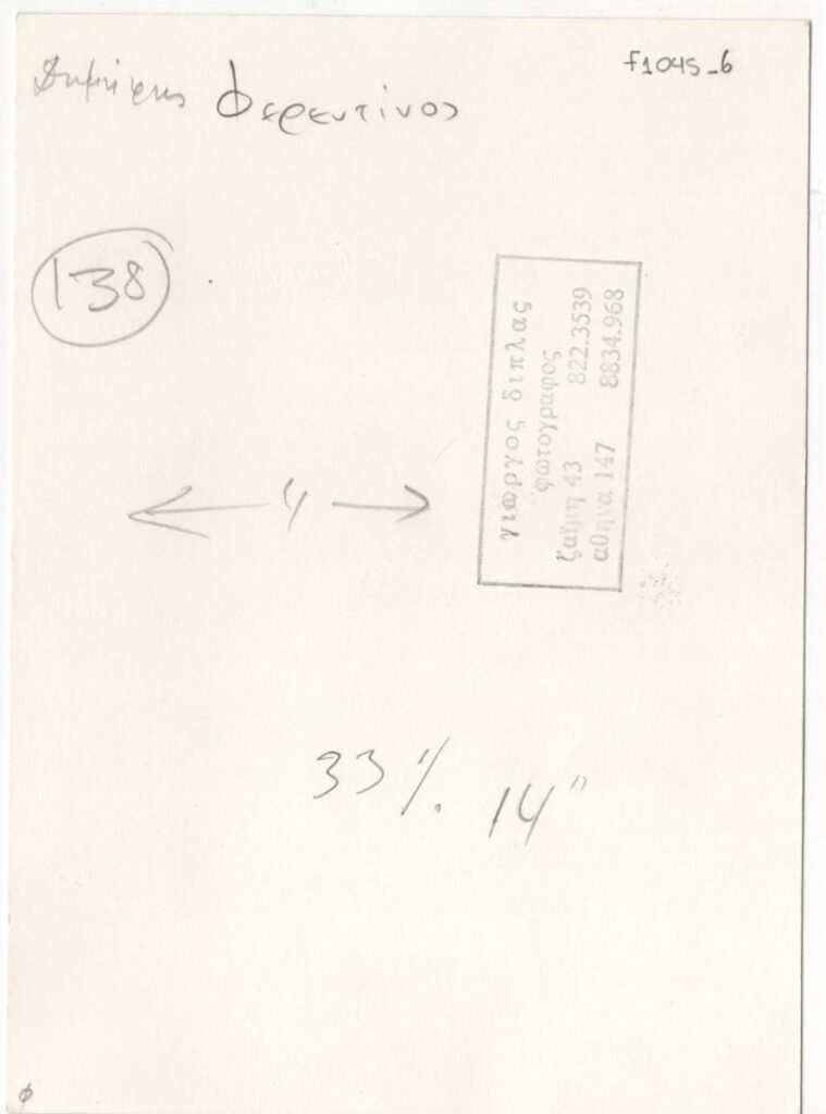 Φωτογραφία, α/μ, φωτογραφικό χαρτί, 17,8×13,0 εκ. Αναπαραγωγή αυτοπροσωπογραφίας του Δημήτρη Φερεντίνου. Στην πίσω όψη επιγραφή και σφραγίδα του φωτογράφου Γιώργου Δίπλα.