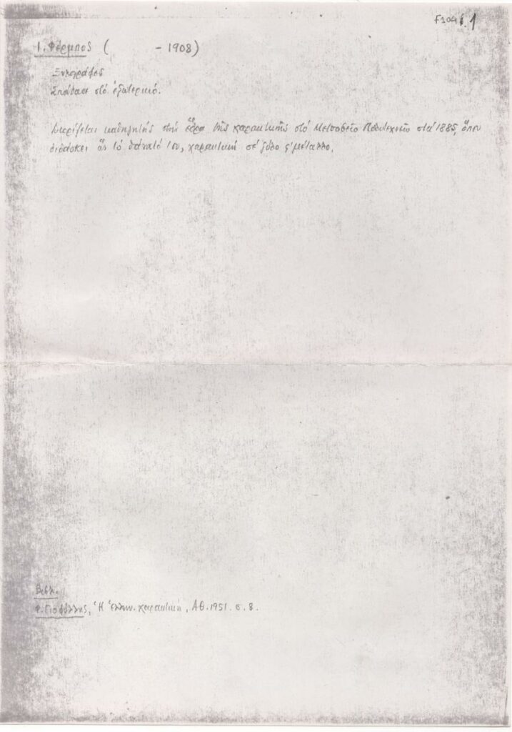 Φωτοαντίγραφο κειμένου, χειρόγραφου, στα ελληνικά, σε χαρτί, 29,8×21,0 εκ. Σημειώσεις βιογραφικού για τον χαράκτη Ι. Φέρμπο. Αναφέρονται σπουδές και βιβλιογραφία.