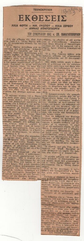 Απόκομμα, έντυπο, χαρτί, 28,3×9,7 εκ., όπου δημοσιεύεται, στα ελληνικά, κριτική του Σπ. Παναγιωτόπουλου για τις εκθέσεις της άνοιξης του 1953. Περιλαμβάνονται οι εκθέσεις των Ηλία Φέρτη, Νικ. Γρίσπου, Ηλία Ζερβού και Άννας Κοντογεώργη. Επάνω επιγραφή.