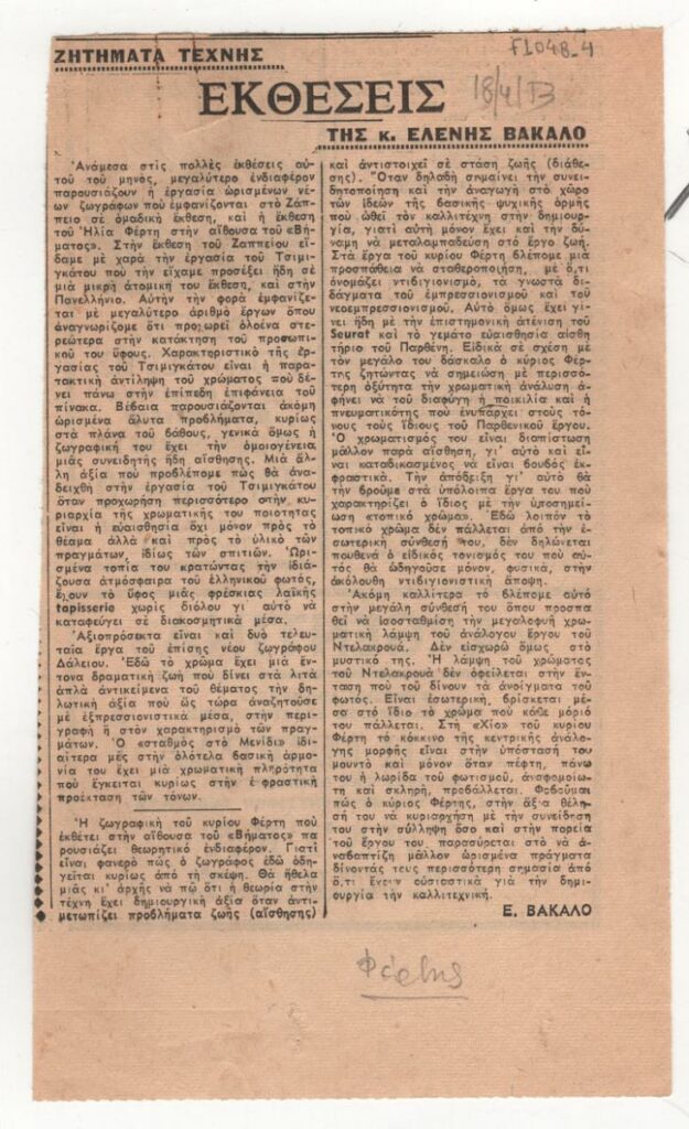Απόκομμα, έντυπο, χαρτί, 18,5×11,0 εκ., όπου δημοσιεύεται, στα ελληνικά, κρτική της ατομικής έκθεσης ζωγραφικής του Ηλία Φέρτη στην Αθήνα το 1953. Επάνω, επιγραφή.