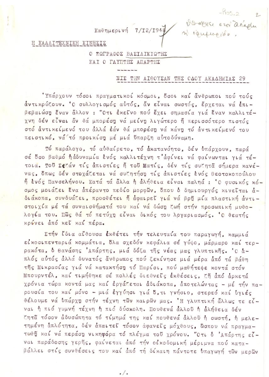 Φωτοαντίγραφο, δακτυλόγραφο, χαρτί, 2 φφ, 29×21 εκ., στα ελληνικά, δημοσίευσης κριτικής εκθέσεων των Αριστοτέλη Βασιλικιώτη και Θανάση Απάρτη.