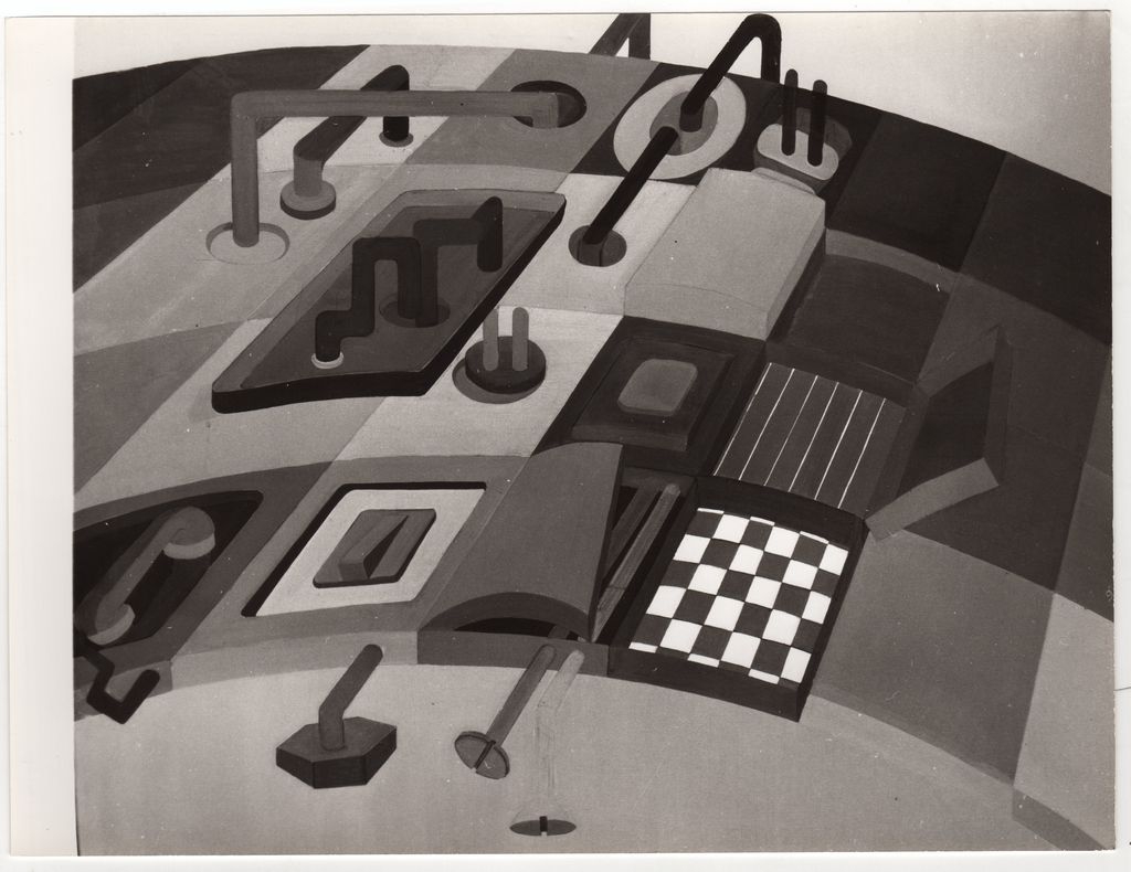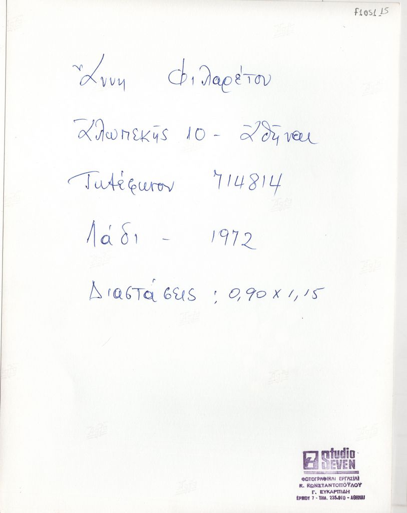Φωτογραφία, α/μ, φωτογραφικό χαρτί, 24,0×18,0 εκ. Αναπαραγωγή έργου της Άννης Φιλαρέτου (λάδι, 1972). Στην πίσω όψη επιγραφή και σφραγίδα φωτογραφείου Studio 7 – Κ. Κωνσταντόπουλος, Γ. Ευκαρπίδης