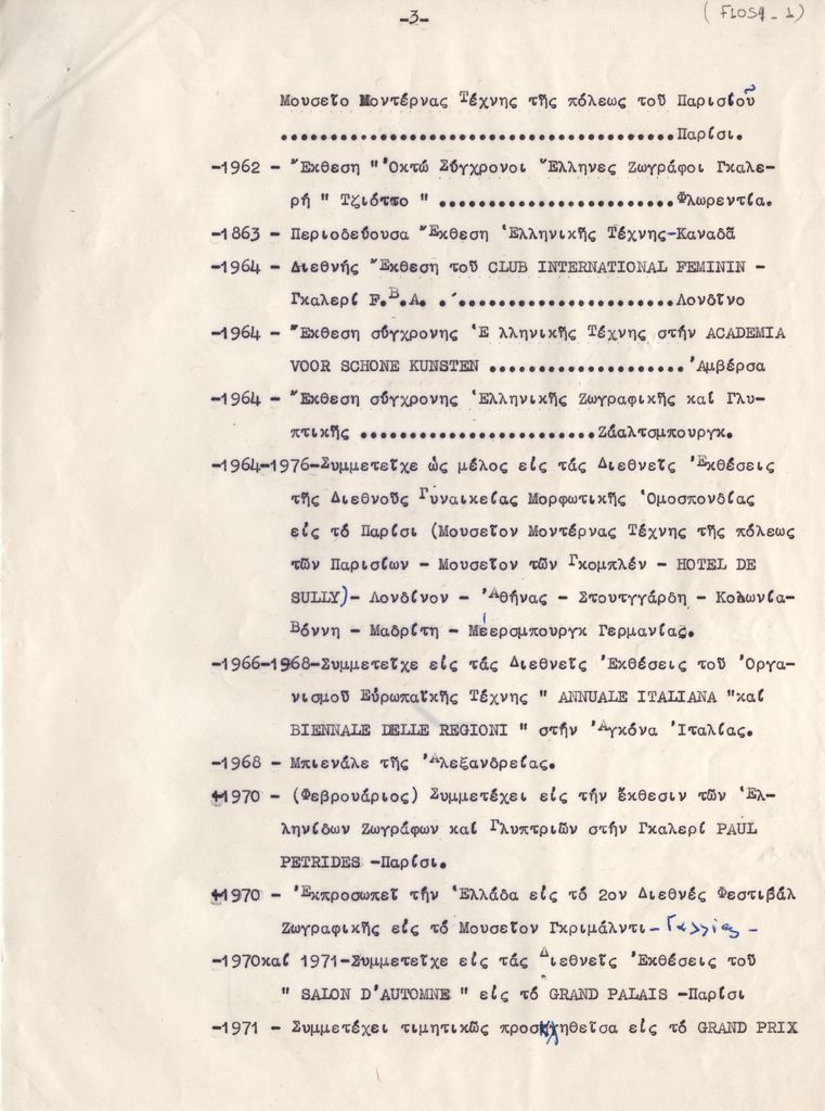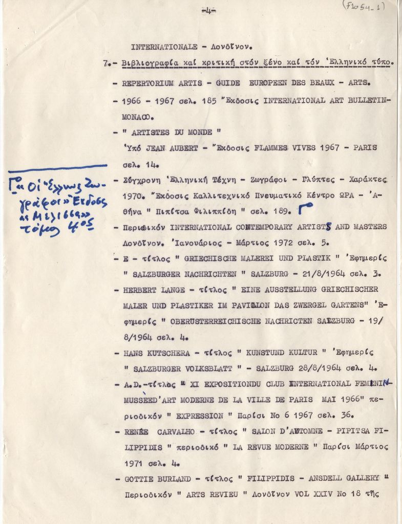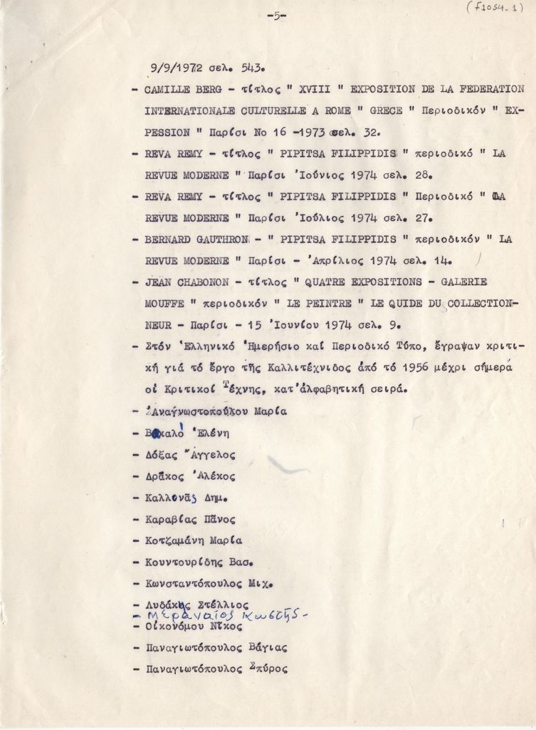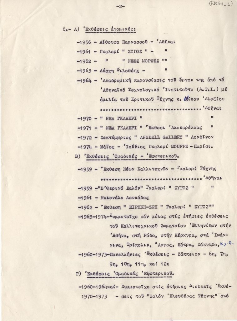 Κείμενο, δακτυλόγραφο με χειρόγραφες διορθώσεις και σημειώσεις, στα ελληνικά, σε χαρτί, 6 φφ, 29,0×21,3 εκ. Βιογραφικό σημείωμα της Πιπίτσα Φιλιππίδη-Μηλιάδου. Αναφέρονται σπουδές, καλλιτεχνική πορεία, εκθέσεις, κριτικές, βιβλιογραφία, διακρίσεις και βραβεύσεις μέχρι το 1973.