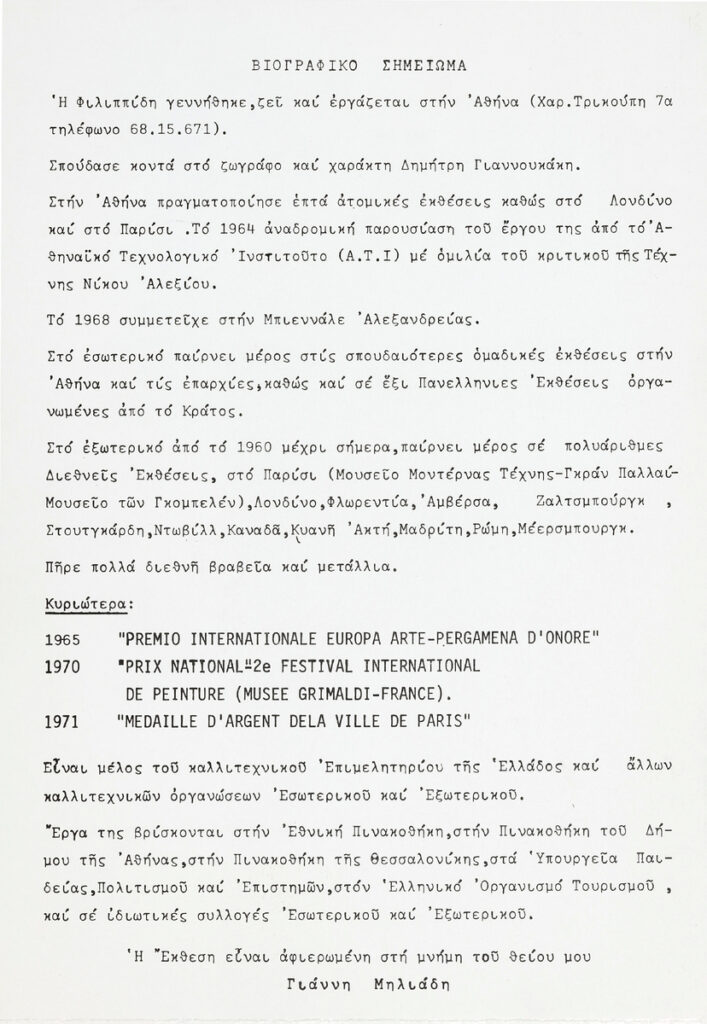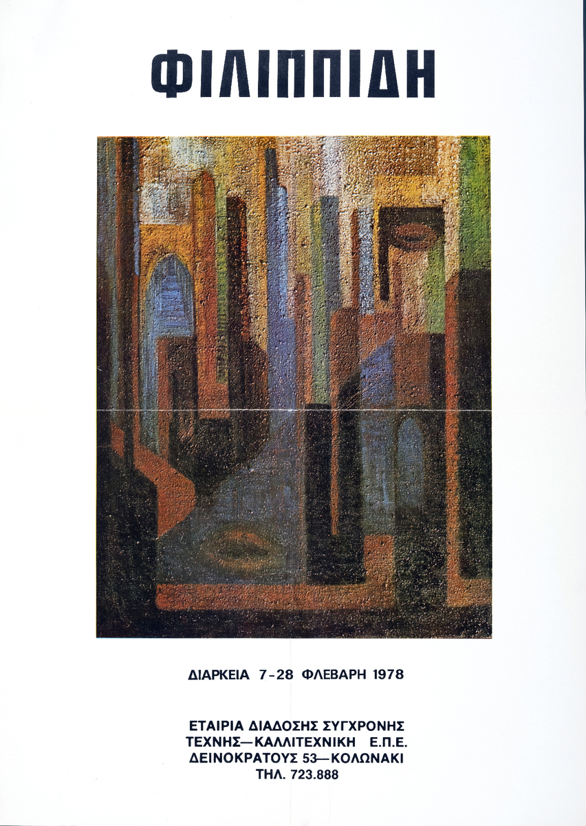 Αφίσα της ατομικής έκθεσης ζωγραφικής της Πιπίτσας Φιλιππίδη στην Εταιρία Διάδοσης Σύγχρονης Τέχνης στην Αθήνα το 1978. Περιέχει σύντομο βιογραφικό καλλιτέχνη και κριτικό σημείωμα του Γιώργου Μουρέλου.