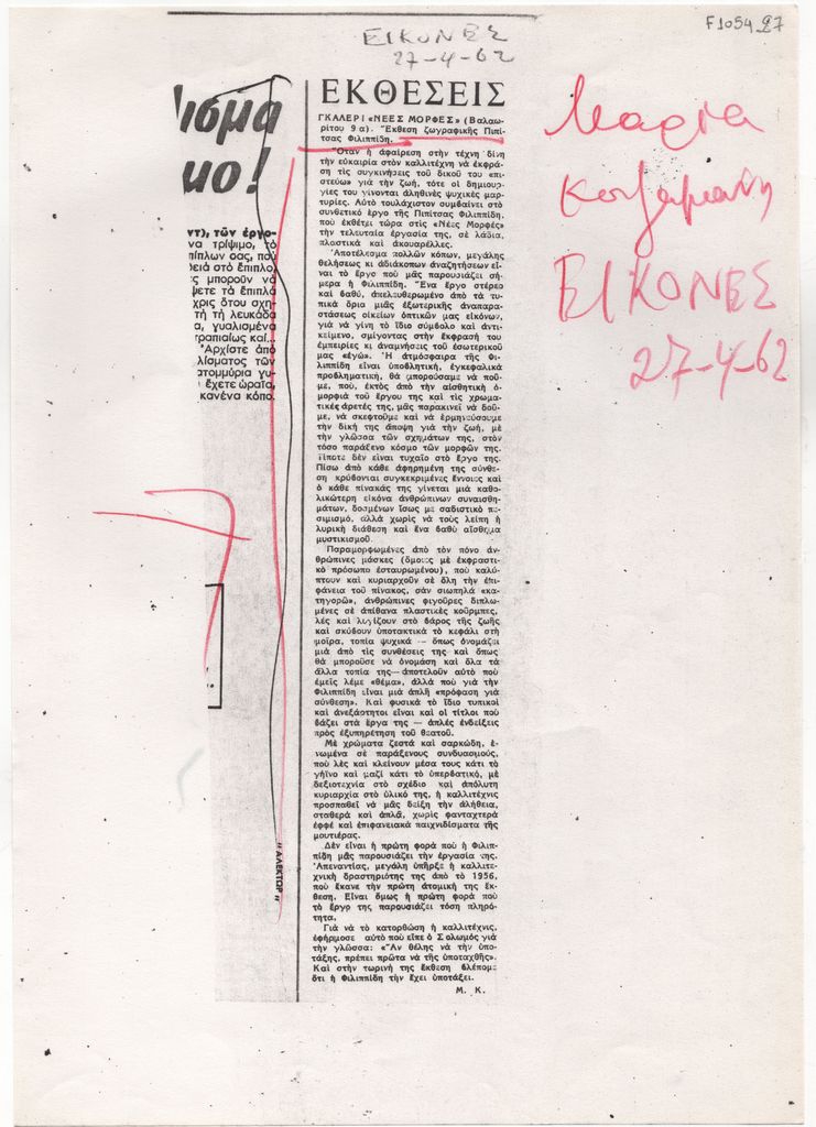 Φωτοαντίγραφο αποκόμματος, έντυπο, χαρτί, 29,8×21,0 εκ., όπου δημοσιεύεται, στα ελληνικά, κριτική της Μαρίας Κοτσαμάνη για την ατομική έκθεση ζωγραφική της Πιπίτσας Φιλιππίδη στην Αθήνα το 1962. Επιγραφές.