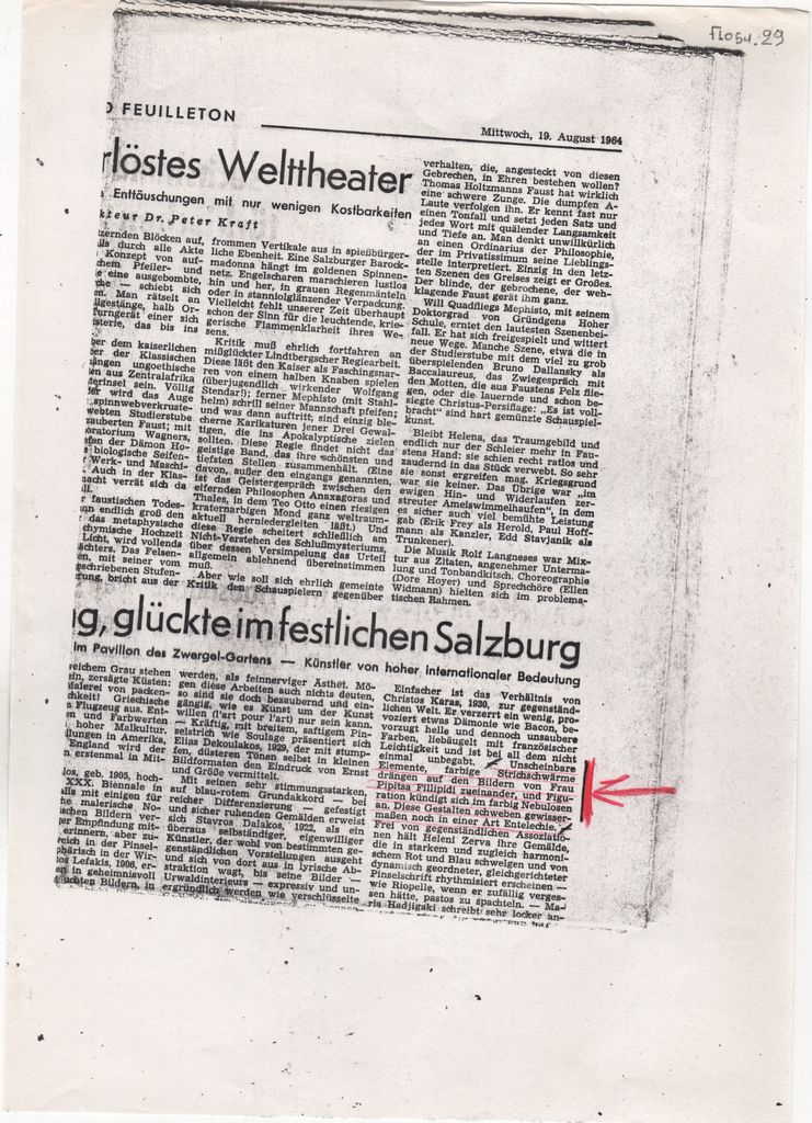 Φωτοαντίγραφο αποκόμματος, έντυπο, χαρτί, 29,8×21,0 εκ., όπου δημοσιεύεται, στα γερμανικά, κριτικής της ομαδικής έκθεσης με γενικό τίτλο “Έκθεση Σύγχρονης Ελληνικής Ζωγραφικής και Γλυπτικής” στο Σάλτσμπουργκ το 1964. Επιγραφές.