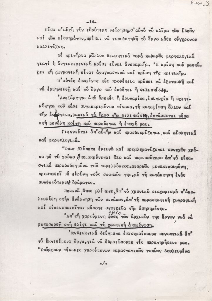 Κείμενο, δακτυλόγραφο, στα ελληνικά, σε χαρτί, 29,8×21,0 εκ. Τμήμα ομιλίας του κριτικού της τέχνη Νίκου Αλεξίου για το έργο της Πιπίτσας Φιλιππίδη με αφορμή την αναδρομική έκθεση της στην Αθήνα το 1964. Συνοδεύεται από σημείωμα, χειρόγραφη, με μπλε μελάνι, στα ελληνικά, απόκομμα χαρτιού, 8,5×21,0 εκ., όπου περιγράφεται το περιεχόμενο του κειμένου (GR TITSpit f1056_4).