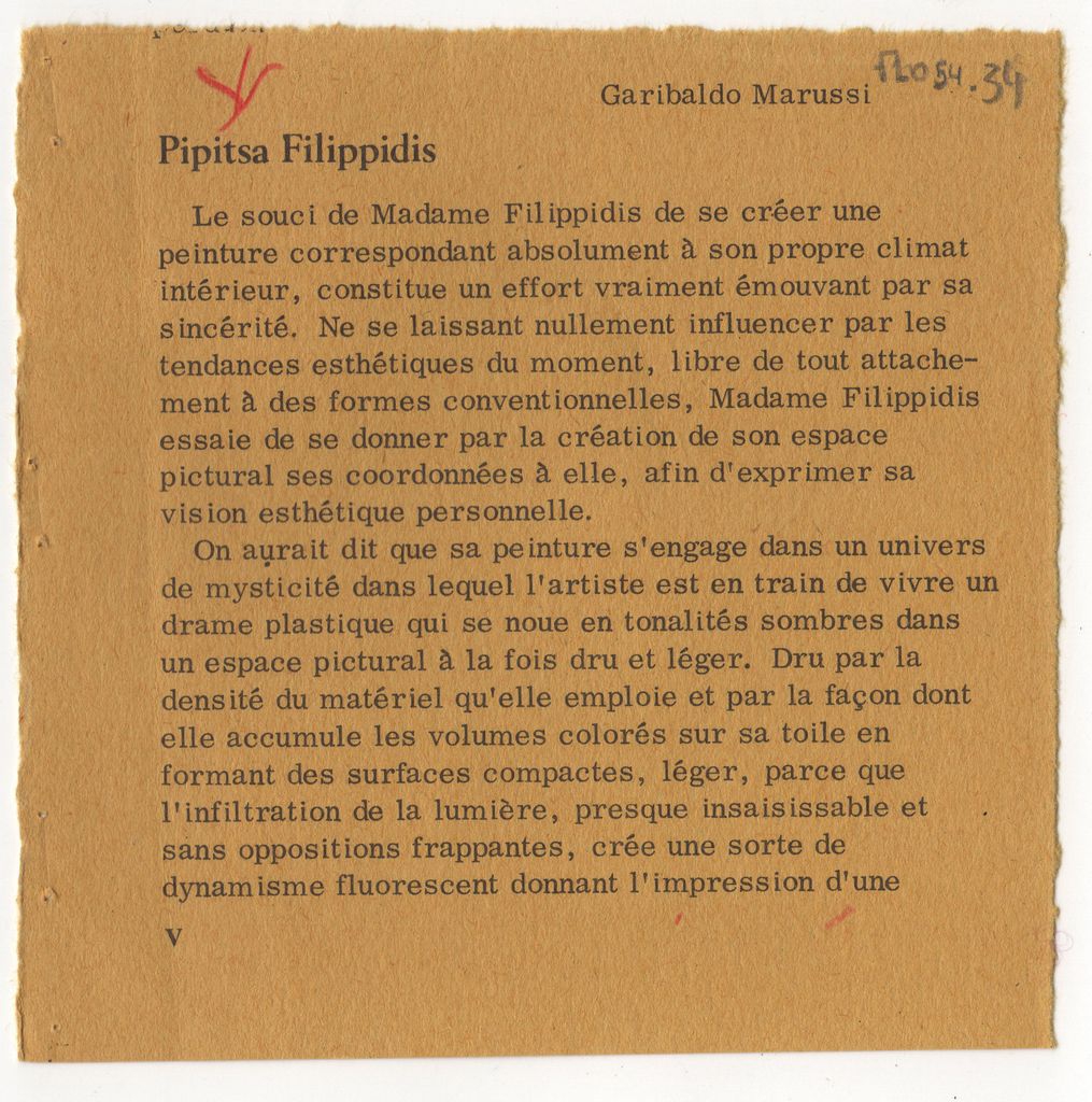 Απόκομμα, έντυπο, χαρτί, 2 τμήματα, 11,0×11,0 και 10,0×11,0 εκ., όπου δημοσιεύεται, στα γαλλικά, κριτικό σημείωμα του Γιώργου Μουρέλου για το έργο της Πιπίτσας Φιλιππίδη.