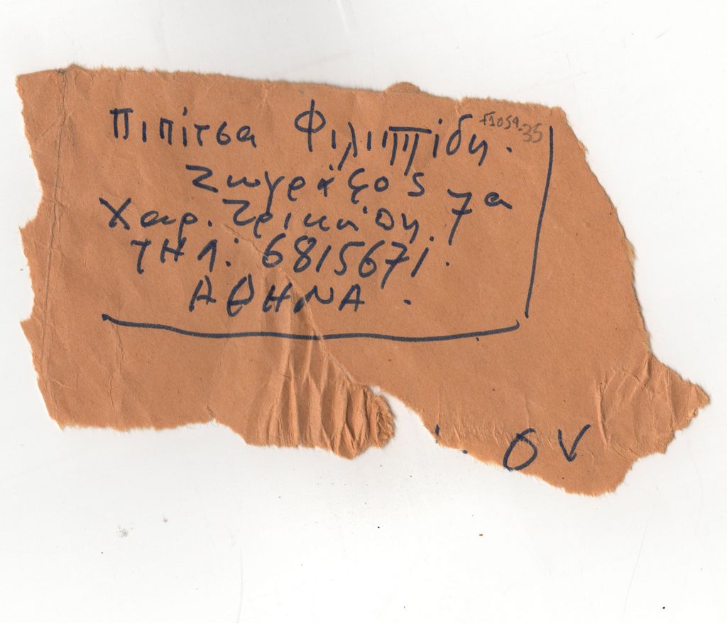 Απόκομμα ταχυδρομικού φακέλου με χειρόγραφη τη διεύθυνση της ζωγράφου Πιπίτσας Φιλιππίδη στην Αθήνα.