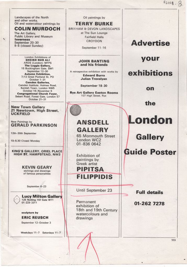 Φωτοαντίγραφο αποκόμματος εντύπου, σε χαρτί, όπου δημοσιεύεται, στα αγγλικά, η αναγγελία της ατομικής έκθεσης της Πιπίτσας Φιλιππίδη στην Ansdell Gallery στο Λονδίνο το 1972. Στο ίδιο απόκομμα δημοσιεύονται επίσης οι αναγγελίες εκθέσεων των: Colin Murdoch, Gerald Parkinson, Kevin Geary, Erich Reusch, Terry Burke και τέλος Edward Burra και Julian Trevelyan. Στην επιφάνεια του αποκόμματος επιγραφές.