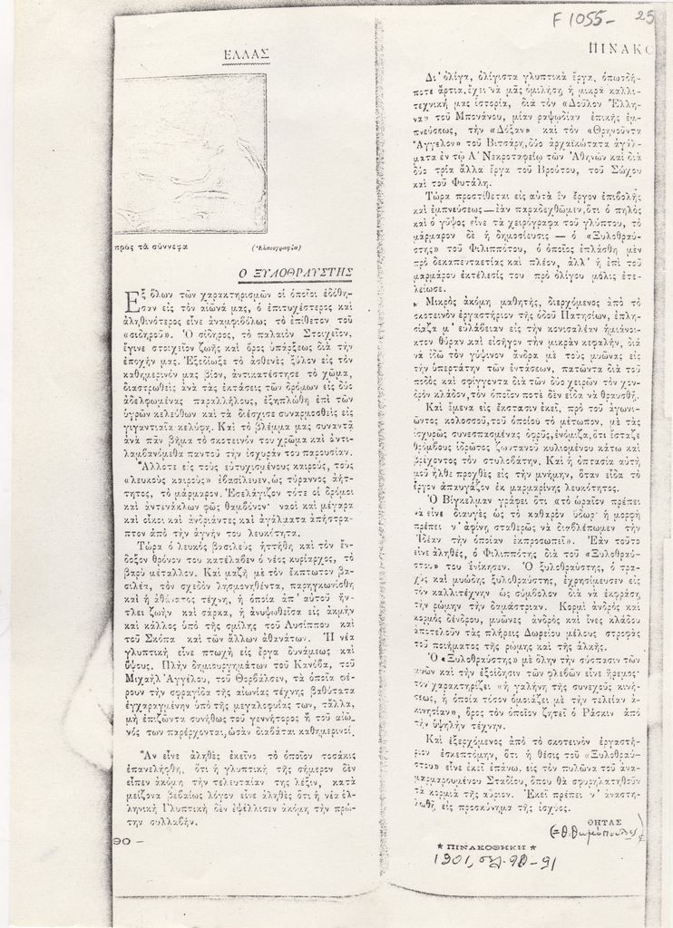Φωτοαντίγραφο, χαρτί, 30×21 εκ., στα ελληνικά, δημοσίευσης άρθρου για εικαστικό έργο του Δημήτριου Φιλιππότη. Σχολιάζεται το έργο του “Ξυλοθραύστης”.