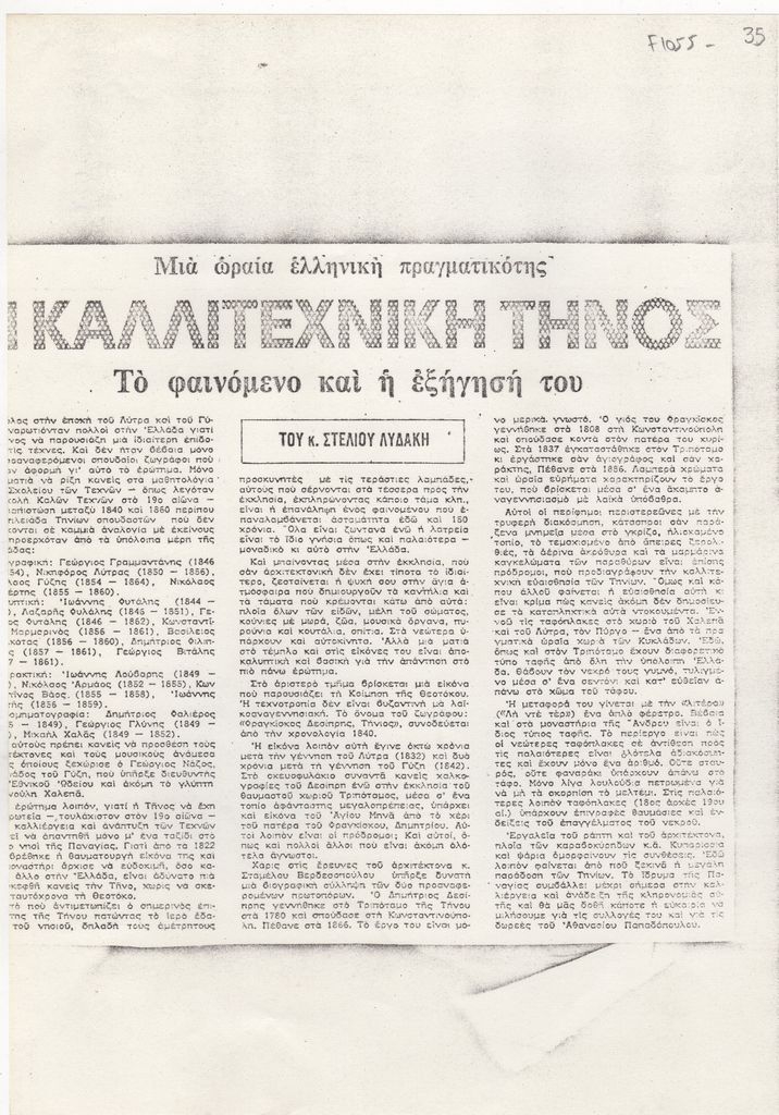 Φωτοαντίγραφο, χαρτί, 30×21 εκ., στα ελληνικά, δημοσίευσης άρθρου αναφερόμενου στους καλλιτέχνες που κατάγονται από την Τήνο, ανάμεσα στους οποίους ο Δημήτρης Φιλιππότης.