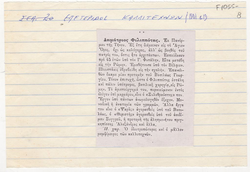 Φωτοαντίγραφο, χαρτί κολλημένο σε λευκή κόλλα, 14×20.5 εκ., στα ελληνικά, δημοσίευσης βιογραφικού σημειώματος του Δημήτριου Φιλιππότη.