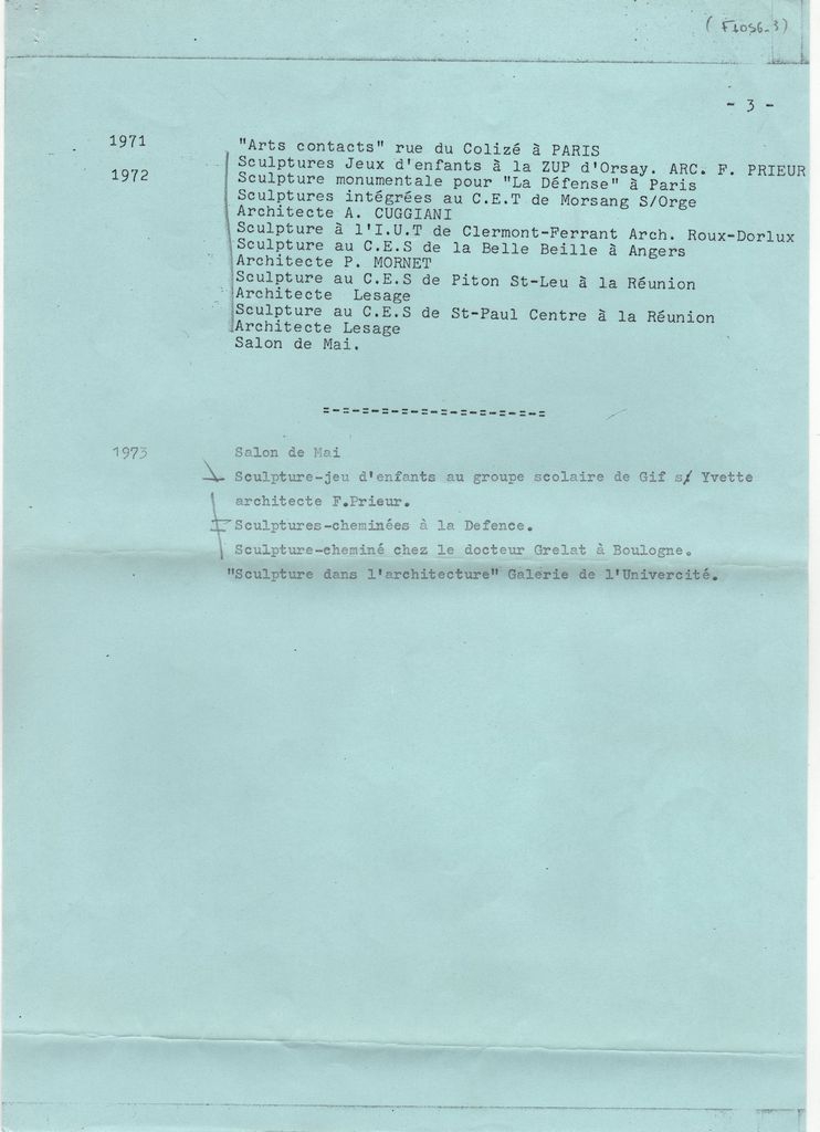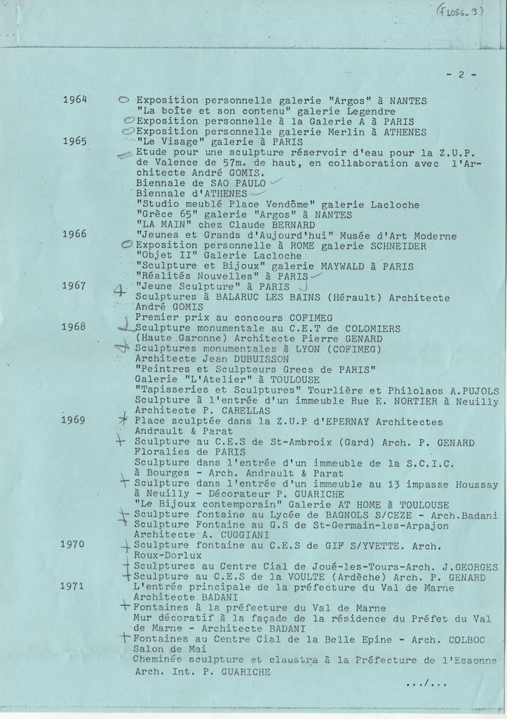Κείμενο, δακτυλόγραφο, στα γαλλικά, σε χαρτί, 3 φφ, 29,8×21,0 εκ. Βιογραφικό σημείωμα του Φιλόλαου Τλούπα, οργανωμένο χρονολογικά. Αναφέρονται σπουδές, ατομικές και ομαδικές εκθέσεις κ.ά.