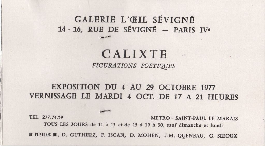 Έντυπο, στα γαλλικά, μονόφυλλο, χαρτόνι, μία όψη, 9,0×16,2 εκ. Πρόσκληση εγκαινίων της ατομικής έκθεσης έργων του Henry Calixte στο Παρίσι το 1977. Παρουσιάζονται επίσης έργων των: D. Gutherz, F. Iscan, D. Mohen, J.-M. Queneau, G. Siroux.