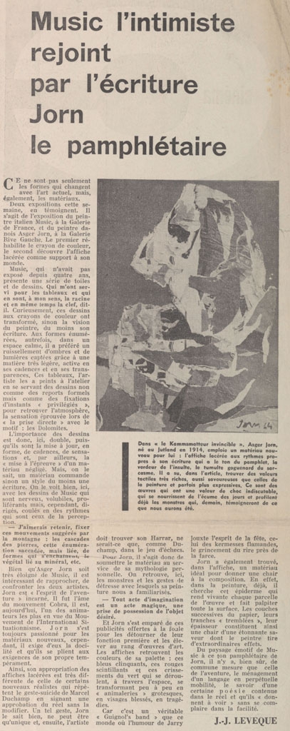 Απόκομμα, έντυπο, χαρτί, 59,0×42,5 εκ., όπου δημοσιεύεται, στα γαλλικά, κριτική του J.J. Leveque για τις ατομικές έκθεσεις των Zoran Anton Music και Asger Jorn στο Παρίσι το 1964. Στην ίδια σελίδα δημοσιεύονται επίσης: Michel Ragon “Philolaos: Entre l’ humour et le merveilleux”, P.C. “Des réforms laborieuses” σχετικά με τη δημιουργία της École d’Architecture, κριτική εκθέσεων και εκθεσιολόγιο της περιόδου.