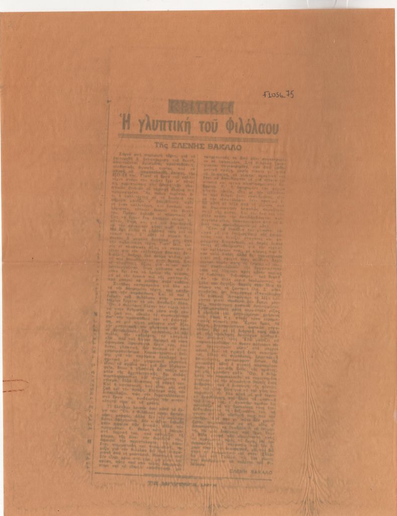 Φωτοαντίγραφο αποκόμματος, έντυπο, χαρτί, 27,0×21,0 εκ., όπου δημοσιεύεται, στα ελληνικά, κριτική της Ελένης Βακαλό για το έργο του Φιλόλαου Τλούπα.