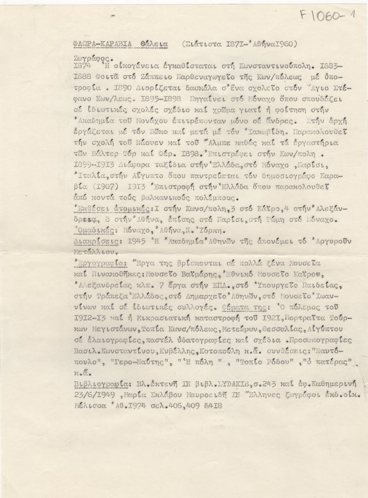 Βιογραφικό, δακτυλόγραφο, χαρτί, 29×21 εκ., στα ελληνικά της Θάλειας Φλωρά-Καραβία.