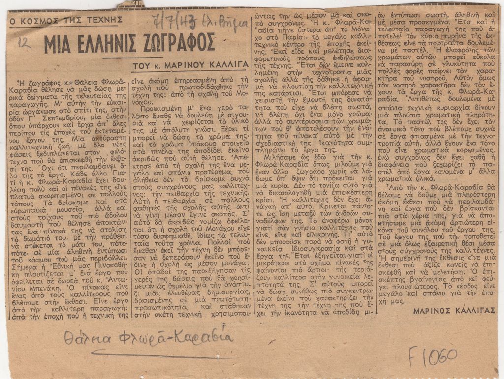 Απόκομμα, χαρτί, 14.5×19 εκ., στα ελληνικά, δημοσίευσης κριτικής έκθεσης της Θάλειας Φλωρά- Καραβία, η οποία διεξάγεται στο εργαστήριο της καλλιτέχνιδας.