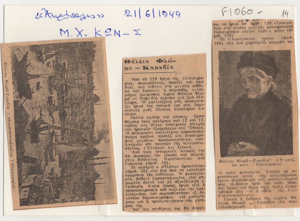 Απόκομμα, χαρτί, 3 φφ συρραμμένα σε έντυπο, 12.5×17 εκ., στα ελληνικά, δημοσίευσης κριτικής έκθεσης της Θάλειας Φλωρά-Καραβία, η οποία διεξάγεται στο Ζάππειο Μέγαρο.