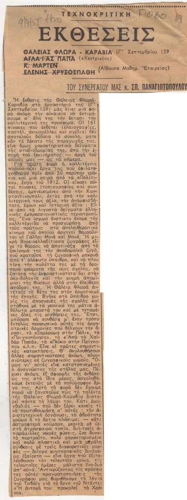 Απόκομμα, χαρτί ακανόνιστου μεγέθους, στα ελληνικά, δημοσίευσης κριτικής έκθεσης της Θάλειας Φλωρά-Καραβία, η οποία διεξάγεται στο καλλιτεχνικό της εργαστήρι στην Αθήνα.